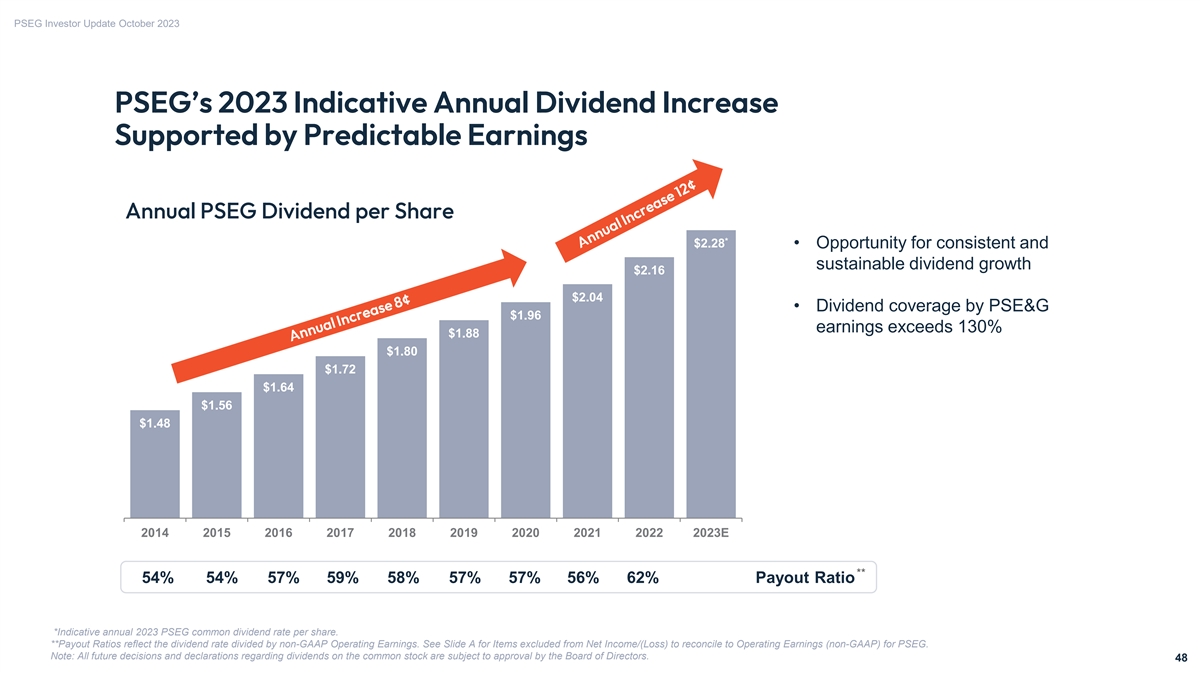 PSEG Investor Update October 2023 PSEG’s 2023 Indicative Annual Dividend Increase Supported by Predictable Earnings Annual PSEG Dividend per Share * $2.28 • Opportunity for consistent and sustainable dividend growth $2.16 $2.04 • Dividend coverage by PSE&G $1.96 earnings exceeds 130% $1.88 $1.80 $1.72 $1.64 $1.56 $1.48 2014 2015 2016 2017 2018 2019 2020 2021 2022 2023E ** 54% 54% 57% 59% 58% 57% 57% 56% 62% Payout Ratio *Indicative annual 2023 PSEG common dividend rate per share. **Payout Ratios reflect the dividend rate divided by non-GAAP Operating Earnings. See Slide A for Items excluded from Net Income/(Loss) to reconcile to Operating Earnings (non-GAAP) for PSEG. Note: All future decisions and declarations regarding dividends on the common stock are subject to approval by the Board of Directors. 48