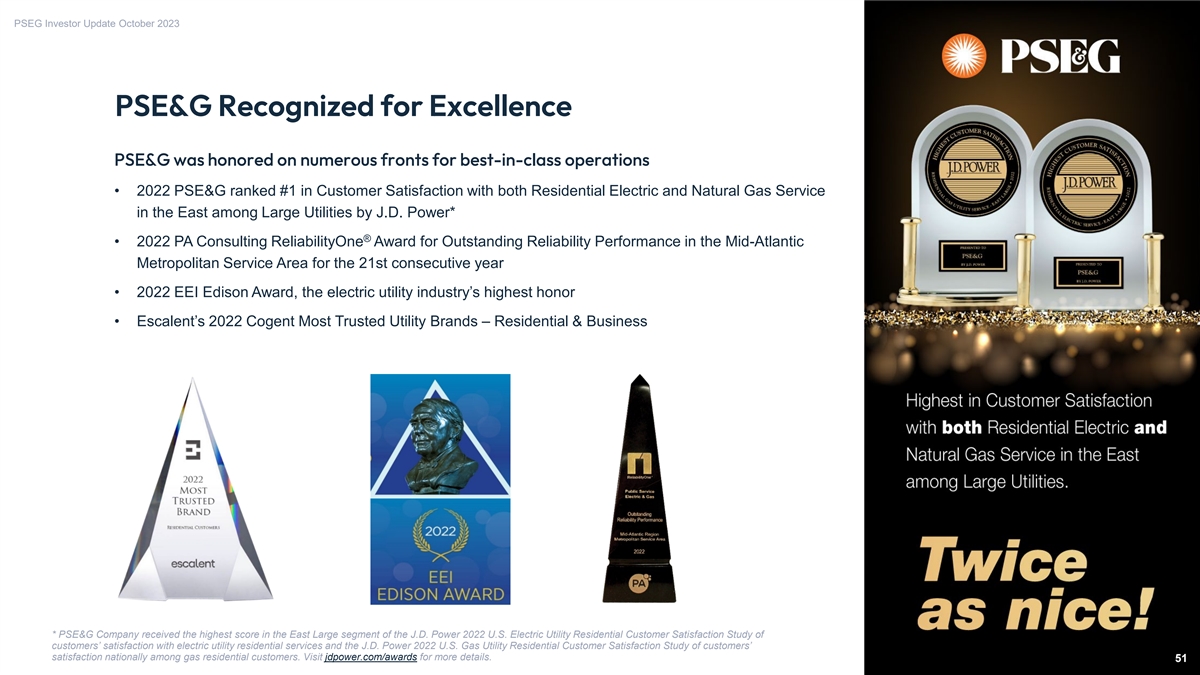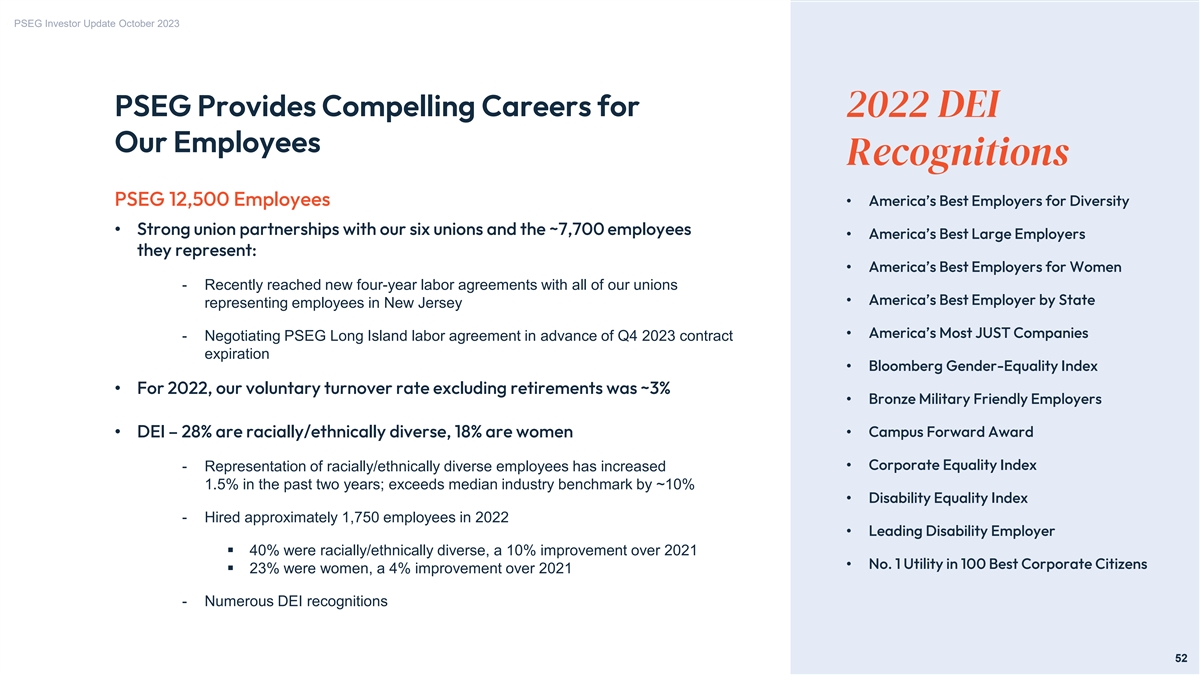PSEG Investor Update October 2023 PSE&G Recognized for Excellence PSE&G was honored on numerous fronts for best-in-class operations • 2022 PSE&G ranked #1 in Customer Satisfaction with both Residential Electric and Natural Gas Service in the East among Large Utilities by J.D. Power* ® • 2022 PA Consulting ReliabilityOne Award for Outstanding Reliability Performance in the Mid-Atlantic Metropolitan Service Area for the 21st consecutive year • 2022 EEI Edison Award, the electric utility industry’s highest honor • Escalent’s 2022 Cogent Most Trusted Utility Brands – Residential & Business * PSE&G Company received the highest score in the East Large segment of the J.D. Power 2022 U.S. Electric Utility Residential Customer Satisfaction Study of customers’ satisfaction with electric utility residential services and the J.D. Power 2022 U.S. Gas Utility Residential Customer Satisfaction Study of customers’ satisfaction nationally among gas residential customers. Visit jdpower.com/awards for more details. 51 51 51