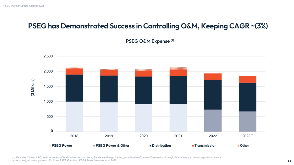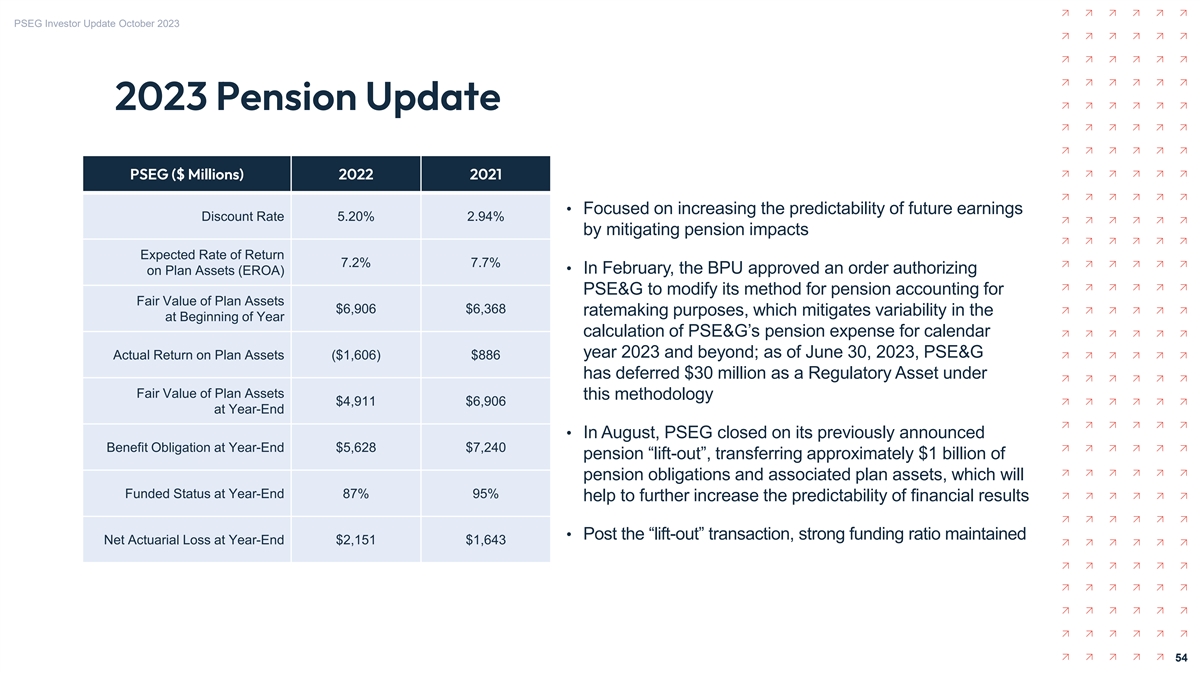 PSEG Investor Update October 2023 PSEG has Demonstrated Success in Controlling O&M, Keeping CAGR ~(3%) (1) PSEG O&M Expense 2,500 2,000 1,500 1,000 500 0 - 2018 2019 2020 2021 2022 2023E PSEG Power PSEG Power & Other Distribution Transmission Other (1) Excludes Nuclear ARO, early retirement of Hudson/Mercer coal plants, Bethlehem Energy Center goodwill write-off, write-offs related to Strategic Alternatives and certain regulatory balance account and pass-through items. Excludes PSEG Fossil and PSEG Power Ventures as of 2022. 53 ($ Millions)