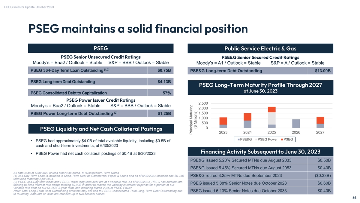 PSEG Investor Update October 2023 PSEG maintains a solid financial position PSEG Public Service Electric & Gas PSEG Senior Unsecured Credit Ratings PSE&G Senior Secured Credit Ratings Moody’s = Baa2 / Outlook = Stable S&P = BBB / Outlook = Stable Moody’s = A1 / Outlook = Stable S&P = A / Outlook = Stable (1,2) PSEG 364-Day Term Loan Outstanding $0.75B PSE&G Long-term Debt Outstanding $13.09B PSEG Long-term Debt Outstanding $4.13B PSEG Long-Term Maturity Profile Through 2027 at June 30, 2023 PSEG Consolidated Debt to Capitalization 57% PSEG Power Issuer Credit Ratings 2,500 Moody’s = Baa2 / Outlook = Stable S&P = BBB / Outlook = Stable 2,000 (2) 1,500 PSEG Power Long-term Debt Outstanding $1.25B 1,000 500 PSEG Liquidity and Net Cash Collateral Postings 0 PSEG Liquidity and Net Cash Collateral Postings 2023 2024 2025 2026 2027 PSE&G PSEG Power PSEG • PSEG had approximately $4.0B of total available liquidity, including $0.5B of cash and short-term investments, at 6/30/2023 Financing Activity Subsequent to June 30, 2023 • PSEG Power had net cash collateral postings of $0.4B at 6/30/2023 PSE&G issued 5.20% Secured MTNs due August 2033 $0.50B PSE&G issued 5.45% Secured MTNs due August 2053 $0.40B All data is as of 6/30/2023 unless otherwise noted. MTNs=Medium-Term Notes (1) 364-Day Term Loan is included in Short-Term Debt as Commercial Paper & Loans and as of 6/30/2023 included one $0.75B PSE&G retired 3.25% MTNs due September 2023 ($0.33B) term loan maturing April 2024. (2) PSEG 364-Day term loans and PSEG Power long-term debt are at a variable rate. As of 6/30/2023, PSEG has entered into PSEG issued 5.88% Senior Notes due October 2028 $0.60B floating-to-fixed interest rate swaps totaling $0.90B in order to reduce the volatility in interest expense for a portion of our variable rate debt on our $1.25B, 3-year term loan maturing March 2025 at PSEG Power. Note: Total Long-Term Debt Outstanding amounts may not add to PSEG Consolidated Total Long-Term Debt Outstanding due PSEG issued 6.13% Senior Notes due October 2033 $0.40B to rounding. Amounts on slide are rounded up to two decimal places. 56 56 Principal Maturing ($ Millions)