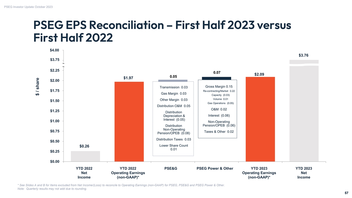 PSEG Investor Update October 2023 PSEG EPS Reconciliation – First Half 2023 versus First Half 2022 $4. $2.00 75 $3.76 $3.75 $2.50 $2.25 0.07 $2.09 0.05 $1.97 $2.00 Gross Margin 0.15 Transmission 0.03 $1.75 Re-contracting/Market 0.22 Gas Margin 0.03 Capacity (0.03) Volume 0.01 Other Margin 0.03 $1.50 Gas Operations (0.05) Distribution O&M 0.05 O&M 0.02 $1.25 Distribution Interest (0.06) Depreciation & Interest (0.05) $1.00 Non-Operating Pension/OPEB (0.06) Distribution Non-Operating $0.75 Taxes & Other 0.02 Pension/OPEB (0.08) Distribution Taxes 0.03 $0.50 Lower Share Count $0.26 0.01 $0.25 $0.00 YTD 2022 YTD 2022 PSE&G PSEG Power & Other YTD 2023 YTD 2023 Net Operating Earnings Operating Earnings Net Income (non-GAAP)* (non-GAAP)* Income * See Slides A and B for Items excluded from Net Income/(Loss) to reconcile to Operating Earnings (non-GAAP) for PSEG, PSE&G and PSEG Power & Other. Note: Quarterly results may not add due to rounding. 57 57 $ / share ~ ~
