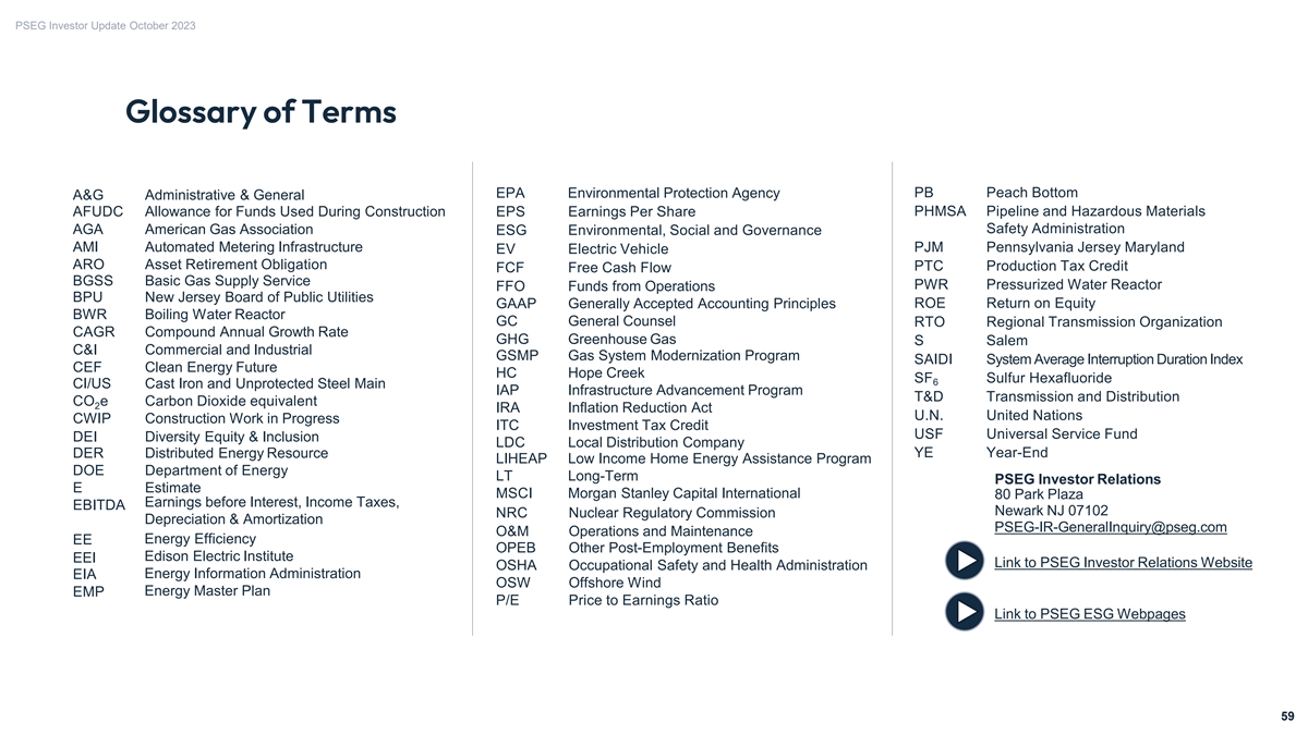 PSEG Investor Update October 2023 Glossary of Terms EPA Environmental Protection Agency PB Peach Bottom A&G Administrative & General AFUDC Allowance for Funds Used During Construction EPS Earnings Per Share PHMSA Pipeline and Hazardous Materials AGA American Gas Association Safety Administration ESG Environmental, Social and Governance AMI Automated Metering Infrastructure PJM Pennsylvania Jersey Maryland EV Electric Vehicle ARO Asset Retirement Obligation PTC Production Tax Credit FCF Free Cash Flow BGSS Basic Gas Supply Service PWR Pressurized Water Reactor FFO Funds from Operations BPU New Jersey Board of Public Utilities ROE Return on Equity GAAP Generally Accepted Accounting Principles BWR Boiling Water Reactor GC General Counsel RTO Regional Transmission Organization CAGR Compound Annual Growth Rate GHG Greenhouse Gas S Salem C&I Commercial and Industrial GSMP Gas System Modernization Program SAIDI System Average Interruption Duration Index CEF Clean Energy Future HC Hope Creek SF Sulfur Hexafluoride 6 CI/US Cast Iron and Unprotected Steel Main IAP Infrastructure Advancement Program T&D Transmission and Distribution CO e Carbon Dioxide equivalent 2 IRA Inflation Reduction Act U.N. United Nations CWIP Construction Work in Progress ITC Investment Tax Credit USF Universal Service Fund DEI Diversity Equity & Inclusion LDC Local Distribution Company YE Year-End DER Distributed Energy Resource LIHEAP Low Income Home Energy Assistance Program DOE Department of Energy LT Long-Term PSEG Investor Relations E Estimate MSCI Morgan Stanley Capital International 80 Park Plaza Earnings before Interest, Income Taxes, EBITDA Newark NJ 07102 NRC Nuclear Regulatory Commission Depreciation & Amortization PSEG-IR-GeneralInquiry@pseg.com O&M Operations and Maintenance EE Energy Efficiency OPEB Other Post-Employment Benefits Edison Electric Institute EEI Link to PSEG Investor Relations Website OSHA Occupational Safety and Health Administration Energy Information Administration EIA OSW Offshore Wind EMP Energy Master Plan P/E Price to Earnings Ratio Link to PSEG ESG Webpages 59 59