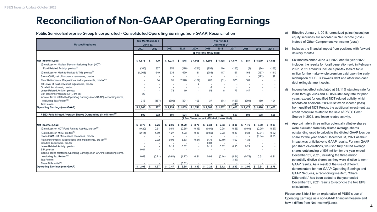 PSEG Investor Update October 2023 Reconciliation of Non-GAAP Operating Earnings a) Effective January 1, 2018, unrealized gains (losses) on Public Service Enterprise Group Incorporated - Consolidated Operating Earnings (non-GAAP) Reconciliation equity securities are recorded in Net Income (Loss) Six Months Ended Year Ended instead of Other Comprehensive Income (Loss). Reconciling Items June 30, December 31, 2022 2021 2020 2019 2018 2017 2023 2022 2016 2015 2014 b) Includes the financial impact from positions with forward ($ millions, Unaudited) delivery months. c) Six months ended June 30, 2022 and full year 2022 Net Income (Loss) $ 1,878 $ 129 $ 1,031 $ (648) $ 1,905 $ 1,693 $ 1,438 $ 1,574 $ 887 $ 1,679 $ 1,518 (Gain) Loss on Nuclear Decommissioning Trust (NDT) includes the results for fossil generation sold in February (a) Fund Related Activity, pre-tax (100) 257 270 ( 178) ( 231) (255) 144 (133) (5) (24) ( 138) 2022. 2021 amounts include a pre-tax loss of $298 (b) (Gain) Loss on Mark-to-Market (MTM), pre-tax (1,068) 949 635 620 81 ( 285) 117 167 168 ( 157) ( 111) million for the make-whole premium paid upon the early Storm O&M, net of insurance recoveries, pre-tax - - - - - - - - - ( 172) 27 redemption of PSEG Power's debt and other non-cash (c) Plant Retirements, Dispositions and Impairments, pre-tax - 14 31 2,940 (122) 402 (51) 975 669 - - debt extinguishment costs. Oil Lower of Cost or Market adjustment, pre-tax - - - - 2 - - - - - - Goodwill Impairment, pre-tax - - - - - 16 - - - - - d) Income tax effect calculated at 28.11% statutory rate for Lease Related Activity, pre-tax - - 78 10 - 58 8 77 147 - - Exit Incentive Program (EIP), pre-tax 20 - - - - - - - - - - 2018 through 2023 and 40.85% statutory rate for prior Income Taxes related to Operating Earnings (non-GAAP) reconciling items, years, except for qualified NDT related activity, which (d) excluding Tax Reform 316 (357) (306) (891) 106 37 (74) (427) ( 391) 150 104 records an additional 20% trust tax on income (loss) Tax Reform - - - - - - - (745) - - - Operating Earnings (non-GAAP) $ 1,046 $ 992 $ 1,739 $ 1,853 $ 1,741 $ 1,666 $ 1,582 $ 1,488 $ 1,475 $ 1,476 $ 1,400 from qualified NDT Funds, the additional investment tax credit recapture related to the sale of PSEG Solar (e) PSEG Fully Diluted Average Shares Outstanding (in millions) 500 502 501 504 507 507 507 507 508 508 508 Source in 2021, and lease related activity. ($ Per Share Impact - Diluted, Unaudited) e) Approximately three million potentially dilutive shares Net Income (Loss) $ 3.76 $ 0.26 $ 2.06 $ (1.29) $ 3.76 $ 3.33 $ 2.83 $ 3.10 $ 1.75 $ 3.30 $ 2.99 (a) were excluded from fully diluted average shares (Gain) Loss on NDT Fund Related Activity, pre-tax (0.20) 0.51 0. 54 ( 0.35) ( 0.46) (0.50) 0. 28 (0.26) (0.01) ( 0.05) (0.27) (b) outstanding used to calculate the diluted GAAP loss per (Gain) Loss on MTM, pre-tax ( 2.14) 1.89 1. 27 1. 23 0. 16 (0.56) 0. 23 0. 33 0. 33 ( 0.31) (0.22) Storm O&M, net of insurance recoveries, pre-tax - - - - - - - - - ( 0.34) 0. 05 share for the year ended December 31, 2021 as their (c) Plant Retirements, Dispositions and Impairments, pre-tax - 0.02 0. 06 5. 83 ( 0.24) 0.79 (0.10) 1. 92 1.32 - - impact was antidilutive to GAAP results. For non-GAAP Goodwill Impairment, pre-tax - - - - - 0.03 - - - - - Lease Related Activity, pre-tax - - 0. 15 0. 02 - 0. 11 0. 02 0. 15 0. 29 - - per share calculations, we used fully diluted average EIP, pre-tax 0. 04 - - - - - - - - - - shares outstanding of 507 million for the year ended Income Taxes related to Operating Earnings (non-GAAP) reconciling items, (d) December 31, 2021, including the three million excluding Tax Reform 0.63 (0.71) (0.61) ( 1.77) 0.21 0. 08 (0.14) (0.84) ( 0.78) 0. 31 0. 21 Tax Reform - - - - - - - (1.47) - - - potentially dilutive shares as they were dilutive to non- (e) Share Differential - - - ( 0.02) - - - - - - - GAAP results. As a result of the use of different Operating Earnings (non-GAAP) $ 2.09 $ 1.97 $ 3.47 $ 3.65 $ 3.43 $ 3.28 $ 3.12 $ 2.93 $ 2.90 $ 2.91 $ 2.76 denominators for non-GAAP Operating Earnings and GAAP Net Loss, a reconciling line item, “Share Differential,” has been added to the year ended December 31, 2021 results to reconcile the two EPS calculations. . Please see Slide 3 for an explanation of PSEG’s use of Operating Earnings as a non-GAAP financial measure and how it differs from Net Income/(Loss). A 60 60