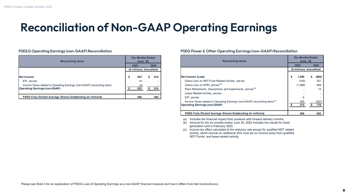 PSEG Investor Update October 2023 Reconciliation of Non-GAAP Operating Earnings PSE&G Operating Earnings (non-GAAP) Reconciliation PSEG Power & Other Operating Earnings (non-GAAP) Reconciliation Six Months Ended Six Months Ended Reconciling Items June, 30, Reconciling Items June, 30, 2023 2022 2023 2022 ($ millions, Unaudited) ($ millions, Unaudited) Net Income (Loss) $ 1,055 $ (685) Net Income $ 823 $ 814 EIP, pre-tax 14 - (Gain) Loss on NDT Fund Related Activity, pre-tax ( 100) 257 (a) Income Taxes related to Operating Earnings (non-GAAP) reconciling items (4) - (Gain) Loss on MTM, pre-tax (1,068) 949 (b) Operating Earnings (non-GAAP) $ 833 $ 814 Plant Retirements, Dispositions and Impairments, pre-tax - 14 Lease Related Activity, pre-tax - - PSEG Fully Diluted Average Shares Outstanding (in millions) 500 502 EIP, pre-tax 6 - (c) Income Taxes related to Operating Earnings (non-GAAP) reconciling items 320 ( 357) Operating Earnings (non-GAAP) $ 213 $ 178 PSEG Fully Diluted Average Shares Outstanding (in millions) 500 502 (a) Includes the financial impact from positions with forward delivery months. (b) Amount for the six months ended June 30, 2022 includes the results for fossil generation sold in February 2022. (c) Income tax effect calculated at the statutory rate except for qualified NDT related activity, which records an additional 20% trust tax on income (loss) from qualified NDT Funds, and lease related activity. Please see Slide 3 for an explanation of PSEG’s use of Operating Earnings as a non-GAAP financial measure and how it differs from Net Income/(Loss). B 61 61