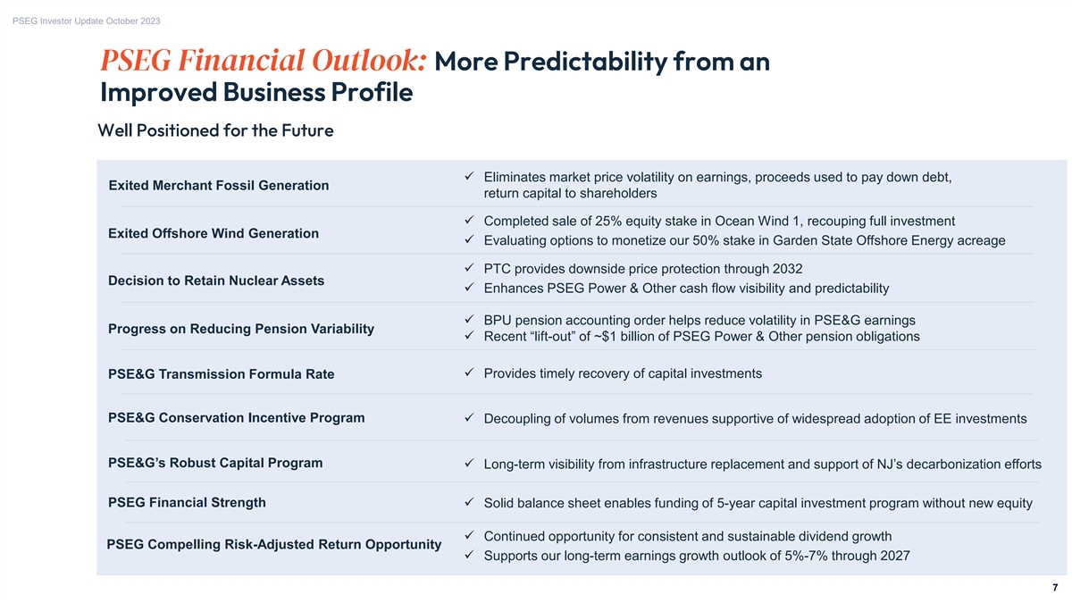 PSEG Investor Update October 2023 PSEG’s Powering Progress Vision: Powering a future where people use less energy, and it’s cleaner, safer and delivered more reliably than ever • Operational Excellence: Best-in-class utility • Disciplined Investment: >90% of capital allocation and strong nuclear performance to PSE&G, aligned with clean energy policies - Investments to modernize utility infrastructure – Energy • Financial Strength: Solid balance sheet to fund Strong, “Last Mile” reliability, GSMP our growth objectives - Investments to support decarbonization – Energy Efficiency, EV, AMI, Solar and other - No new equity required to support 5-year capital plan - Solid investment grade ratings supported by credit metrics that allow for incremental investment - PTC provides long-term certainty and downside price ...which produces a strong protection for Nuclear business mix and platform - Cost control supports customer affordability with one of the lowest gas bills and below average electric bills for predictable growth vs. regional peers 6 6