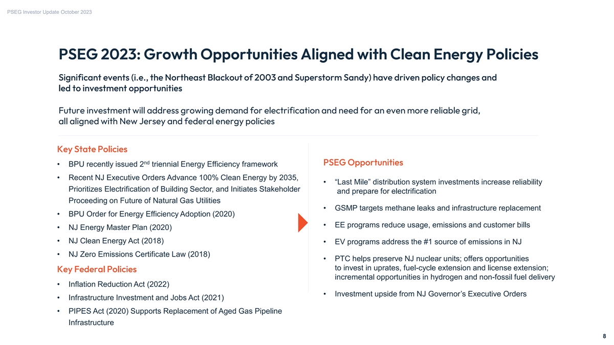 PSEG Investor Update October 2023 PSEG Financial Outlook: More Predictability from an Improved Business Profile Well Positioned for the Future ü Eliminates market price volatility on earnings, proceeds used to pay down debt, Exited Merchant Fossil Generation return capital to shareholders ü Completed sale of 25% equity stake in Ocean Wind 1, recouping full investment Exited Offshore Wind Generation ü Evaluating options to monetize our 50% stake in Garden State Offshore Energy acreage ü PTC provides downside price protection through 2032 Decision to Retain Nuclear Assets ü Enhances PSEG Power & Other cash flow visibility and predictability ü BPU pension accounting order helps reduce volatility in PSE&G earnings Progress on Reducing Pension Variability ü Recent “lift-out” of ~$1 billion of PSEG Power & Other pension obligations PSE&G Transmission Formula Rateü Provides timely recovery of capital investments PSE&G Conservation Incentive Program ü Decoupling of volumes from revenues supportive of widespread adoption of EE investments PSE&G’s Robust Capital Program ü Long-term visibility from infrastructure replacement and support of NJ’s decarbonization efforts PSEG Financial Strength ü Solid balance sheet enables funding of 5-year capital investment program without new equity ü Continued opportunity for consistent and sustainable dividend growth PSEG Compelling Risk-Adjusted Return Opportunity ü Supports our long-term earnings growth outlook of 5%-7% through 2027 7 7 7