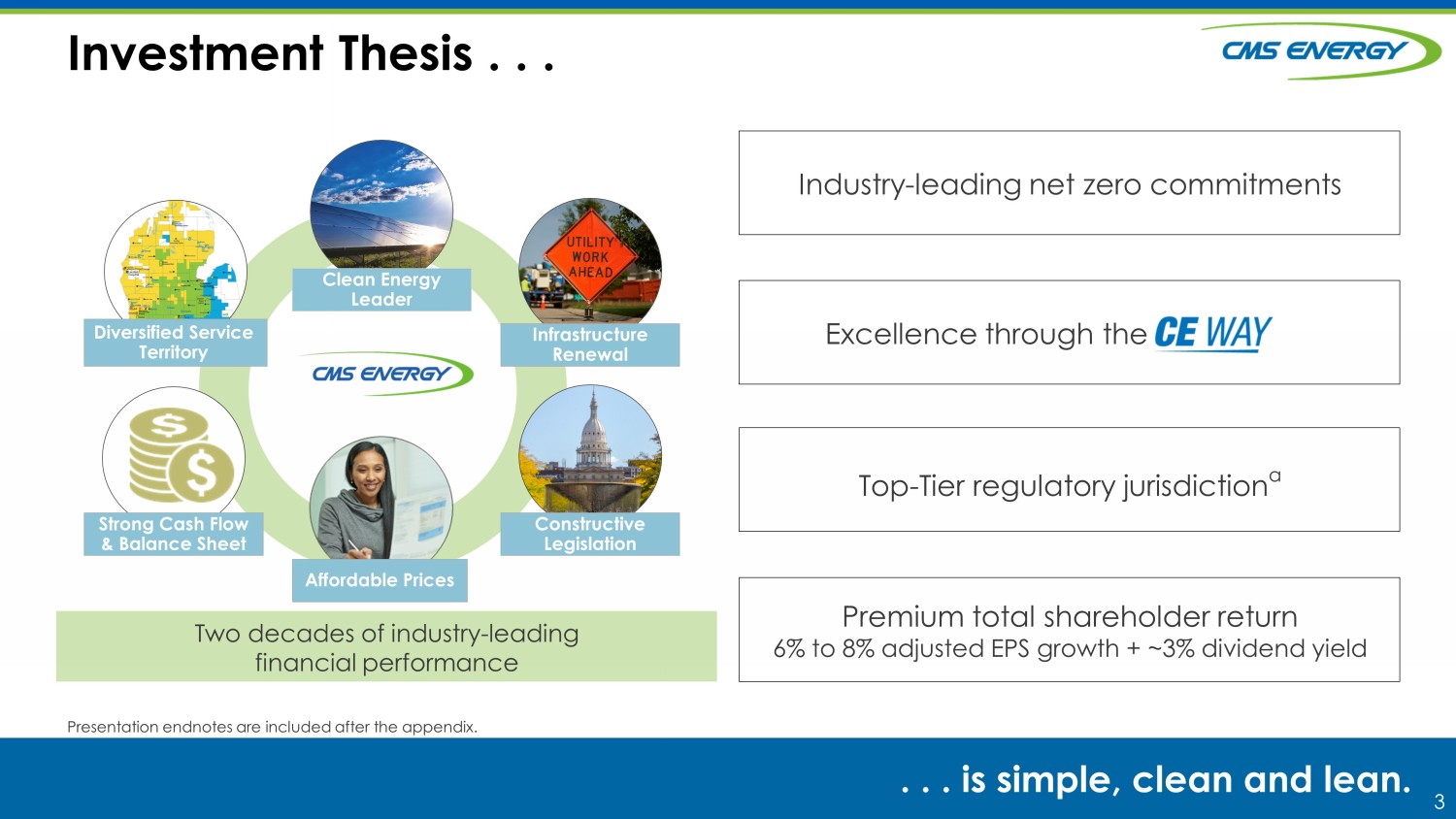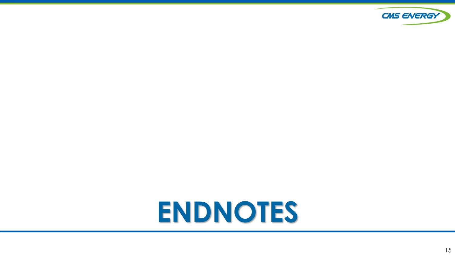2 Enter “so what” if necessary – Century Gothic, Bold, Size 18 or smaller This presentation is made as of the date hereof and contains “forward - looking statements” as defined in Rule 3b - 6 of the Securit ies Exchange Act of 1934, Rule 175 of the Securities Act of 1933, and relevant legal decisions. The forward - looking statements are subject to risks and uncertainties. All forward - lo oking statements should be considered in the context of the risk and other factors detailed from time to time in CMS Energy’s and Consumers Energy’s Securities and Exchange Commissi on filings. Forward - looking statements should be read in conjunction with “FORWARD - LOOKING STATEMENTS AND INFORMATION” and “RISK FACTORS” sections of CMS Energy’s and Consumers Energy’s most recent Form 10 - K and as updated in reports CMS Energy and Consumers Energy file with the Securities and Exchange Commission. CMS Energy’s and Cons ume rs Energy’s “FORWARD - LOOKING STATEMENTS AND INFORMATION” and “RISK FACTORS” sections are incorporated herein by reference and discuss important factors th at could cause CMS Energy’s and Consumers Energy’s results to differ materially from those anticipated in such statements. CMS Energy and Consumers Energy undertake no ob ligation to update any of the information presented herein to reflect facts, events or circumstances after the date hereof. The presentation also includes non - GAAP measures when describing CMS Energy’s results of operations and financial performance. A reconciliation of each of these measures to the most directly comparable GAAP measure is included in the appendix and posted on our website at www.cmsenergy.com . Investors and others should note that CMS Energy routinely posts important information on its website and considers the Inves tor Relations section, www.cmsenergy.com/investor - relations , a channel of distribution. Presentation endnotes are included after the appendix. 2