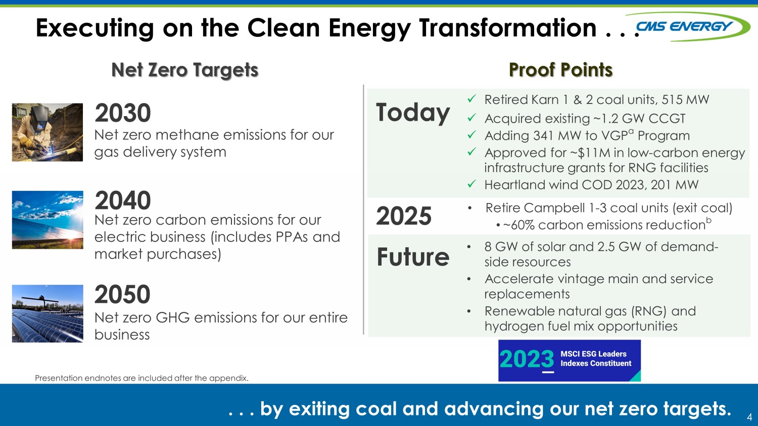 3 Investment Thesis . . . . . . is simple, clean and lean. Infrastructure Renewal Constructive Legislation Strong Cash Flow & Balance Sheet Clean Energy Leader Diversified Service Territory Two decades of industry - leading financial performance Affordable Prices Industry - leading net zero commitments Excellence through the Top - Tier regulatory jurisdiction a Premium total shareholder r eturn 6% to 8% adjusted EPS growth + ~3% dividend yield Presentation endnotes are included after the appendix.