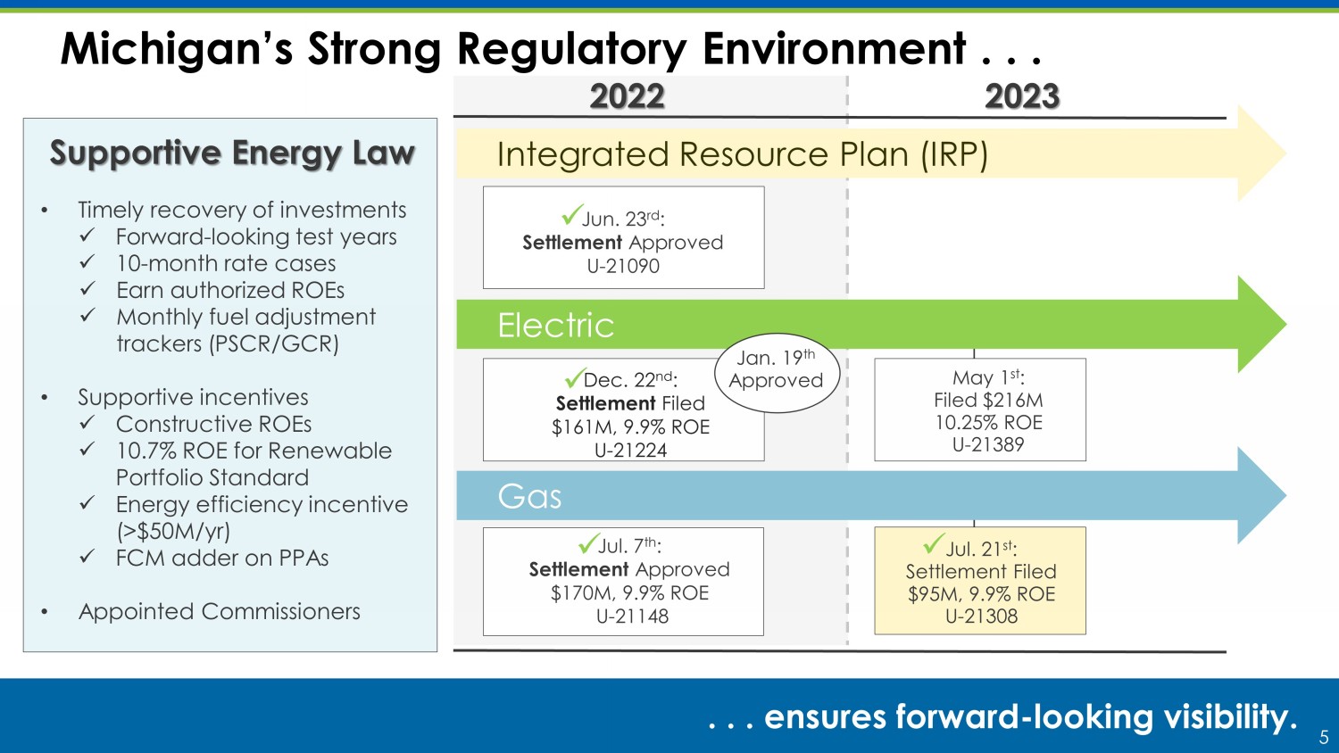 4 Executing on the Clean Energy Transformation . . . Net Zero Targets Proof Points . . . by exiting coal and advancing our net zero targets. Presentation endnotes are included after the appendix. 2030 2040 2050 Net zero methane emissions for our gas delivery system Net zero carbon emissions for our electric business (includes PPAs and market purchases) Net zero GHG emissions for our entire business Today 2025 • R etire Campbell 1 - 3 coal units (exit coal) • ~60% carbon emissions reduction b x Retired Karn 1 & 2 coal units, 515 MW x Acquired existing ~1.2 GW CCGT x Adding 341 MW to VGP a Program x Approved for ~$11M in low - carbon energy infrastructure grants for RNG facilities x Heartland wind COD 2023, 201 MW Future • 8 GW of solar and 2.5 GW of demand - side resources • Accelerate vintage main and service replacements • Renewable natural gas (RNG) and h ydrogen fuel mix opportunities