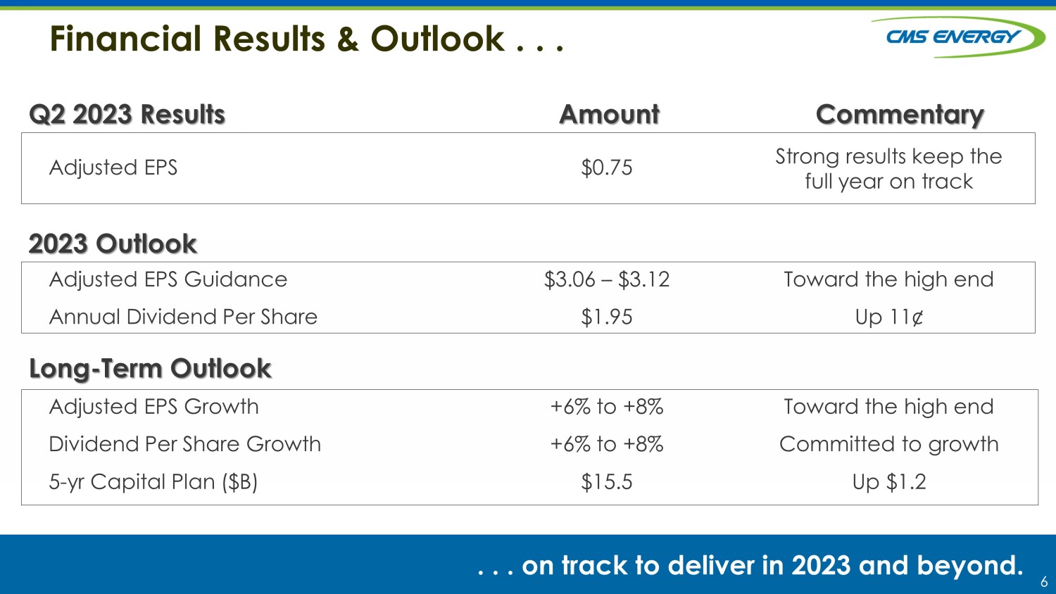 5 2023 Michigan’s Strong Regulatory Environment . . . . . . ensures forward - looking visibility. 2022 Integrated Resource Plan (IRP) Electric Dec. 22 nd : Settlement Filed $161M, 9.9% ROE U - 21224 x x Jun. 23 rd : Settlement Approved U - 21090 Jul. 7 th : Settlement Approved $170M, 9.9% ROE U - 21148 x Supportive Energy Law • Timely recovery of investments x Forward - looking test years x 10 - month rate cases x Earn authorized ROEs x Monthly fuel adjustment trackers (PSCR/GCR) • Supportive incentives x Constructive ROEs x 10.7% ROE for Renewable Portfolio Standard x Energy efficiency incentive (>$50M/yr) x FCM adder on PPAs • Appointed Commissioners Gas Jan. 19 th Approved Jul. 21 st : Settlement Filed $ 95 M, 9.9% ROE U - 21308 May 1 st : Filed $216M 10.25% ROE U - 21389 x