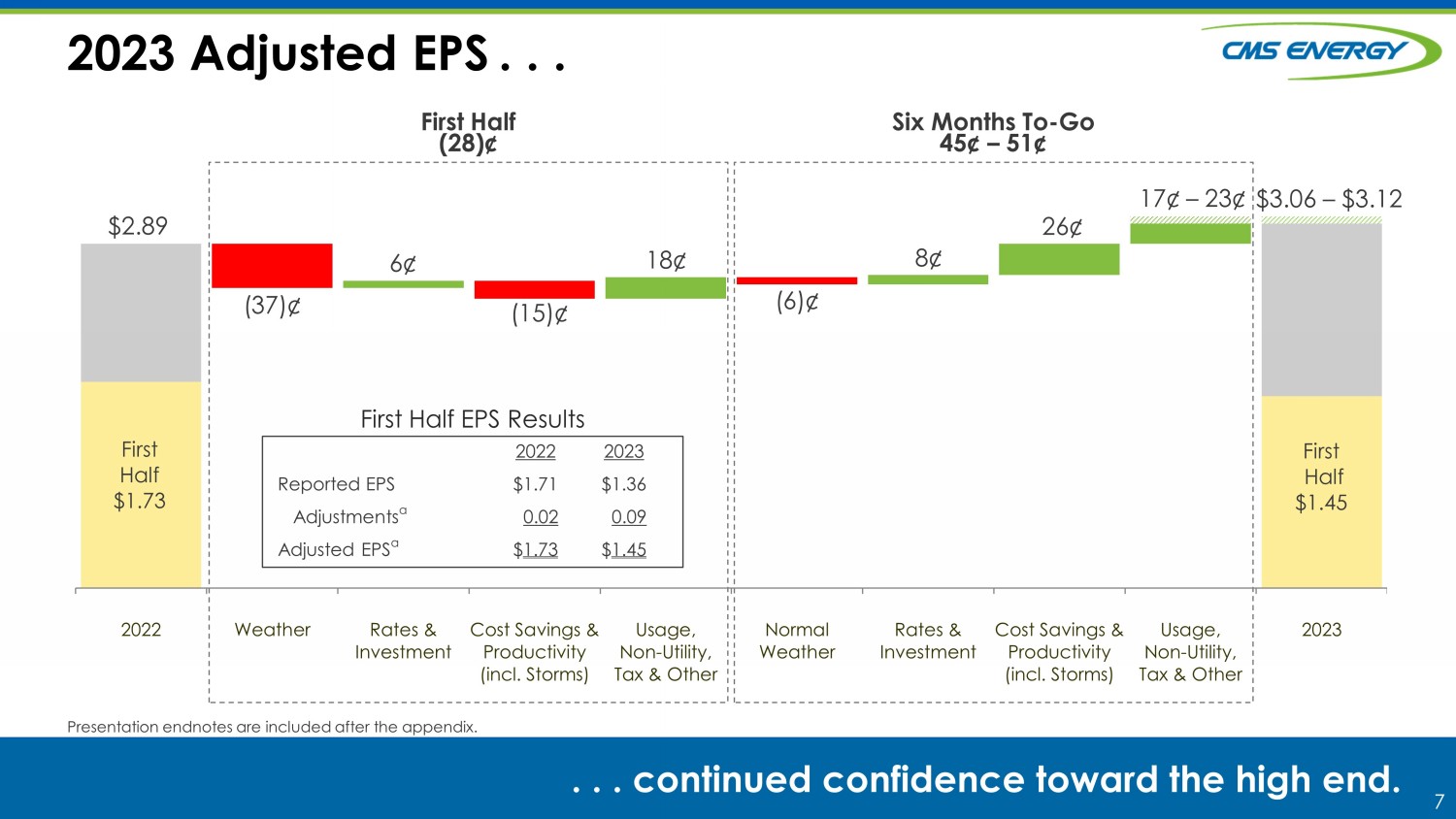 6 Commentary Amount Financial Results & Outlook . . . . . . on track to deliver in 2023 and beyond. Long - Term Outlook 2023 Outlook Q2 2023 Results Adjusted EPS $0.75 Strong results keep the full year on track Adjusted EPS Guidance Annual Dividend Per Share $3.06 – $3.12 $1.95 Toward the high end Up 11¢ Adjusted EPS Growth Dividend Per Share Growth 5 - yr Capital Plan ($B) +6% to +8% +6% to +8% $15.5 Toward the high end Committed to growth Up $1.2