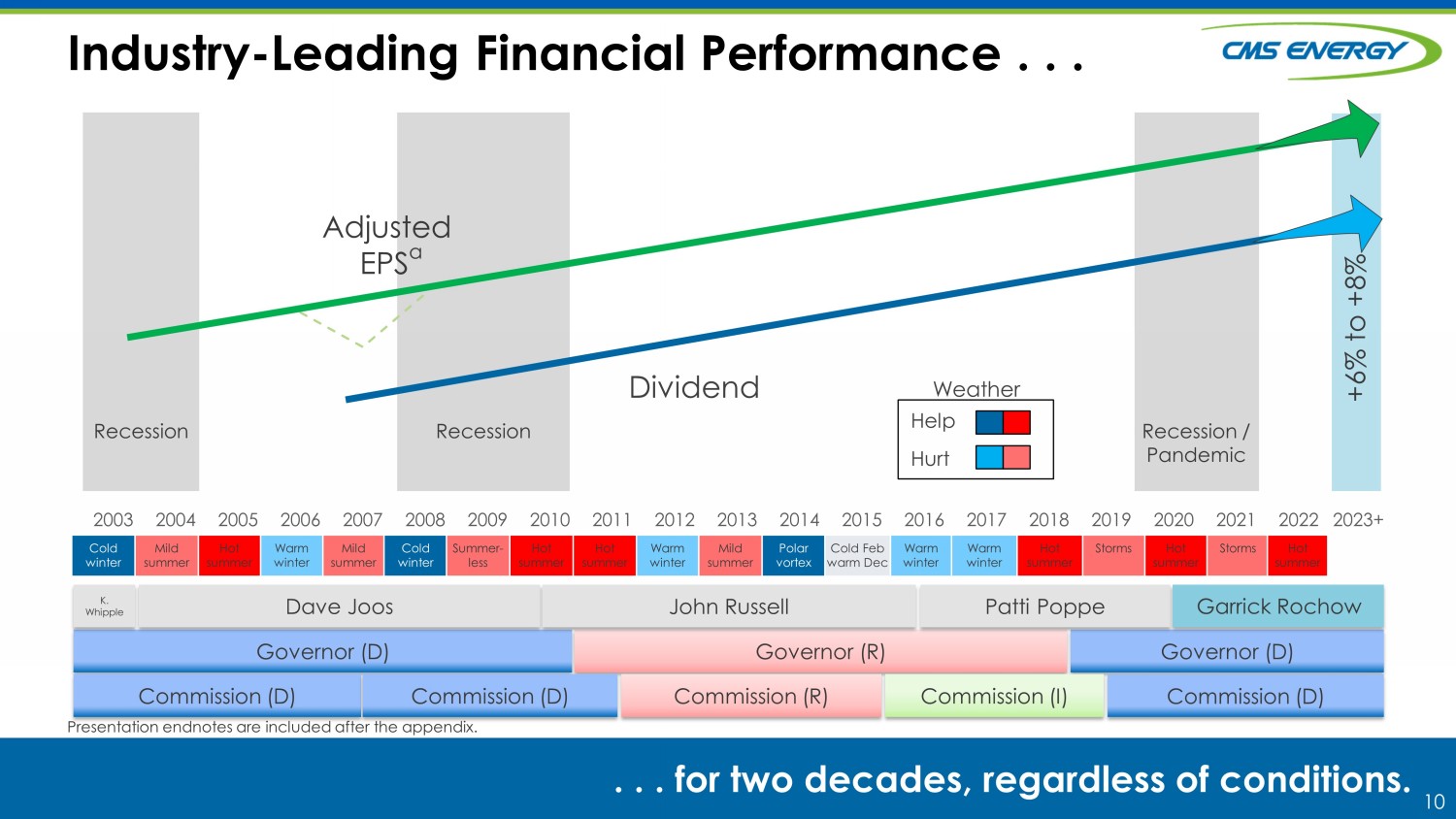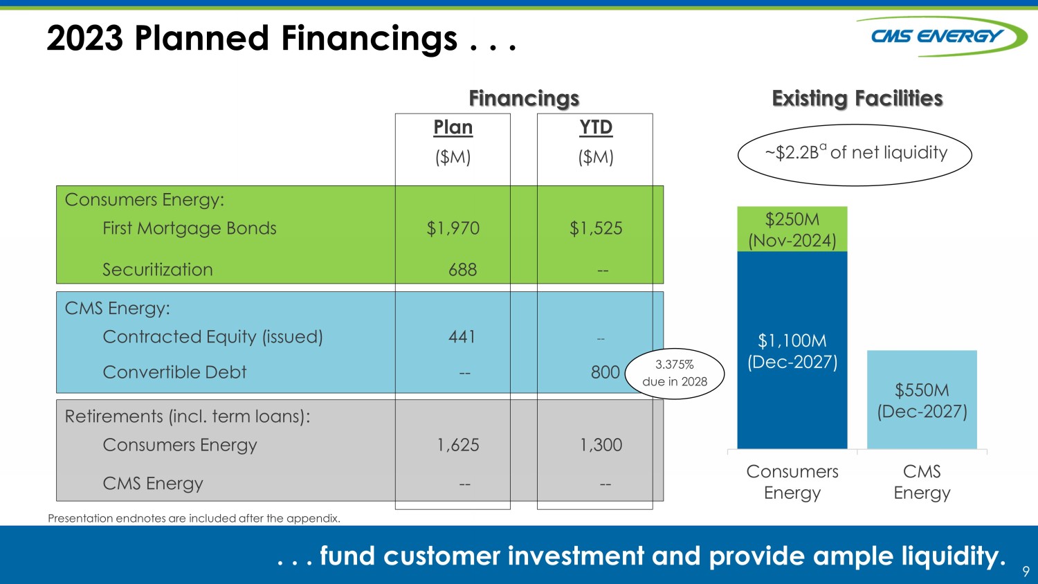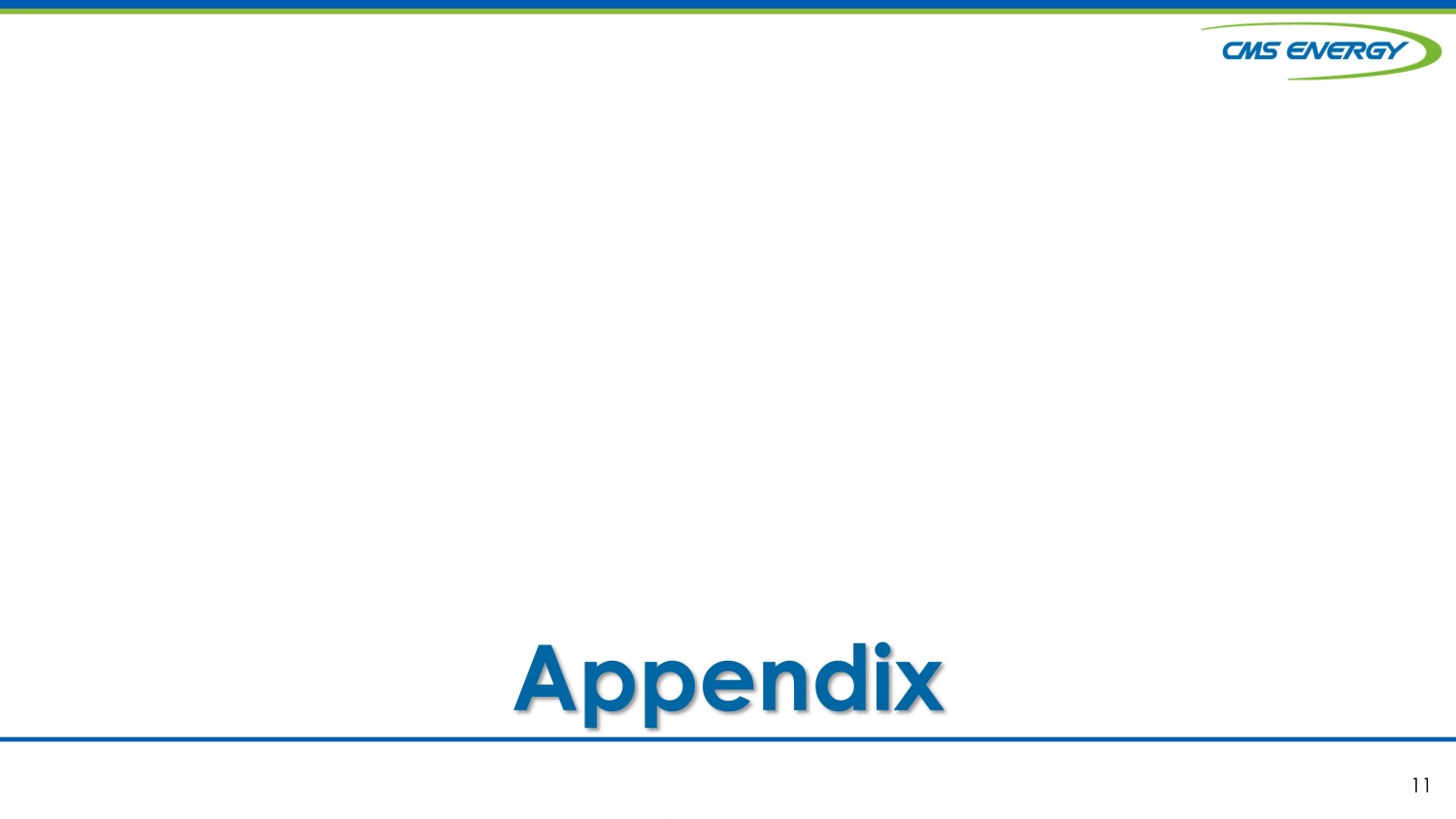 9 Plan YTD ($M) ($M) Consumers Energy: First Mortgage Bonds Securitization $1,970 688 $1,525 -- CMS Energy: Contracted Equity (issued) 441 -- Convertible Debt -- 800 Retirements (incl. term loans): Consumers Energy 1,625 1,300 CMS Energy -- -- Existing Facilities $1,100M (Dec - 2027) $550M (Dec - 2027) $250M (Nov - 2024) Consumers Energy CMS Energy Financings 2023 Planned Financings . . . . . . fund customer investment and provide ample liquidity. Presentation endnotes are included after the appendix. ~$ 2.2 B a of net liquidity 3.375% due in 2028