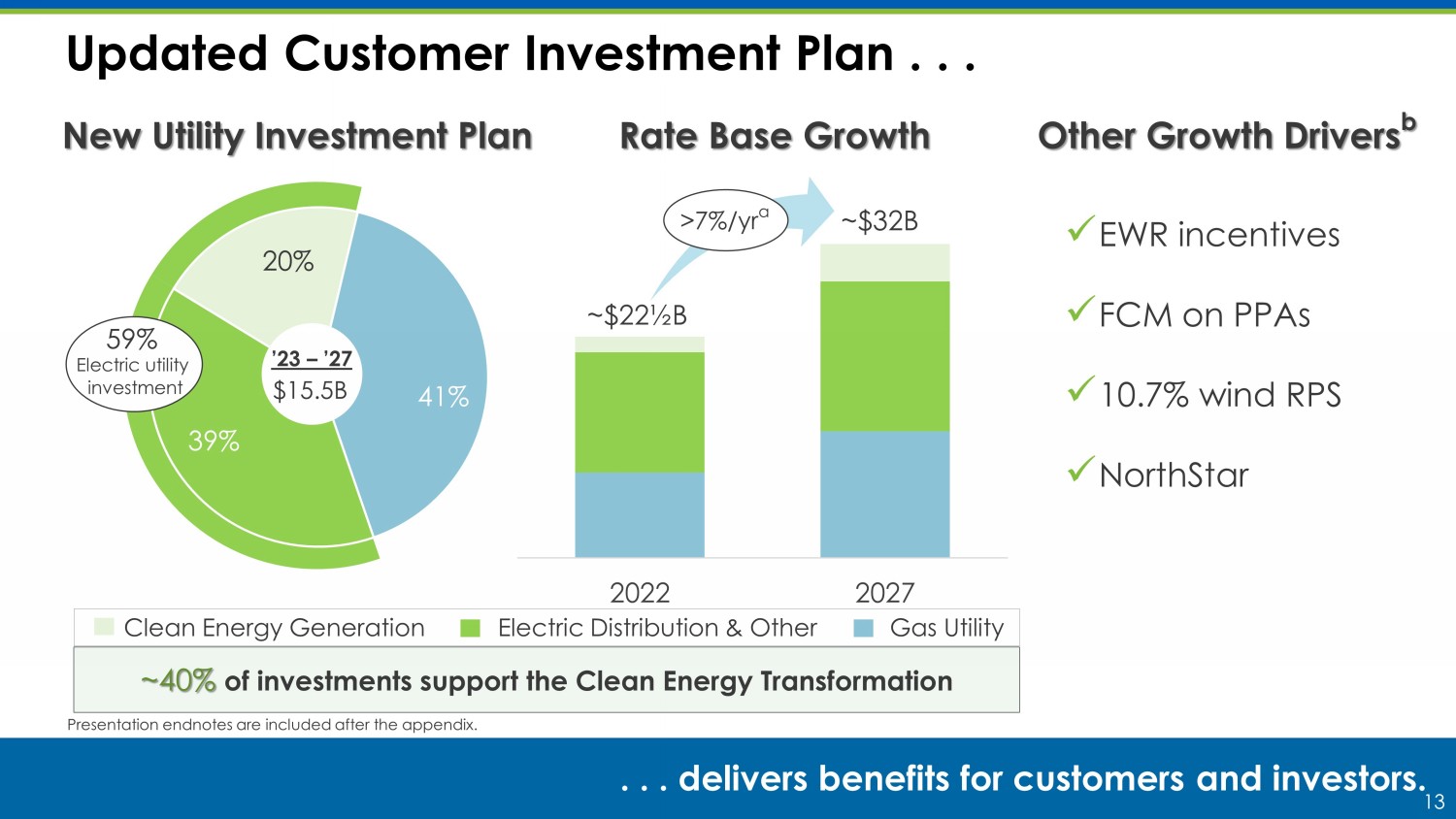 13 39% 20% 41% Updated Customer Investment Plan . . . . . . delivers benefits for customers and investors. New Utility Investment Plan Rate Base Growth Presentation endnotes are included after the appendix. Clean Energy Generation Electric Distribution & Other Gas Utility $15.5B ’23 – ’27 59% Electric utility investment x EWR incentives x FCM on PPAs x 10.7% wind RPS x NorthStar Other Growth Drivers b 2022 2027 ~$22½B ~$32B >7%/ yr a ~40% of investments support the Clean Energy Transformation