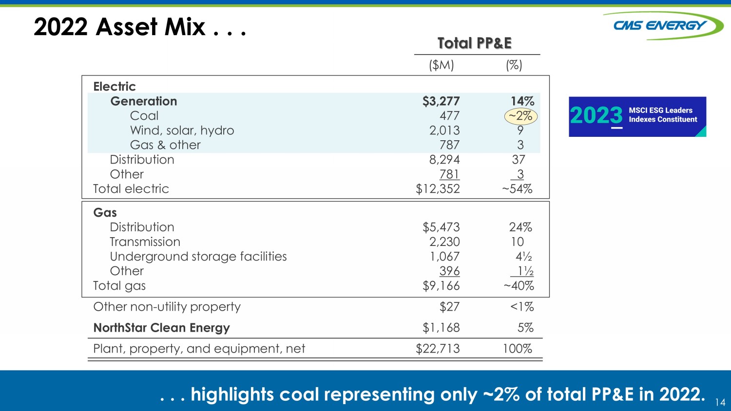 14 2022 Asset Mix . . . Electric Generation Coal Wind, solar, hydro Gas & other Distribution Other Total electric Gas Distribution Transmission Underground storage facilities Other Total gas Other non - utility property NorthStar Clean Energy Plant, property, and equipment, net $3,277 477 2,013 787 8,294 781 $12,352 $5,473 2,230 1,067 396 $9,166 $27 $1,168 $22,713 Total PP&E ($M) (%) 14% ~2% 9 3 37 3 ~54% 24% 10 4½ 1½ ~40% <1% 5% 100% . . . highlights coal representing only ~2% of total PP&E in 2022.