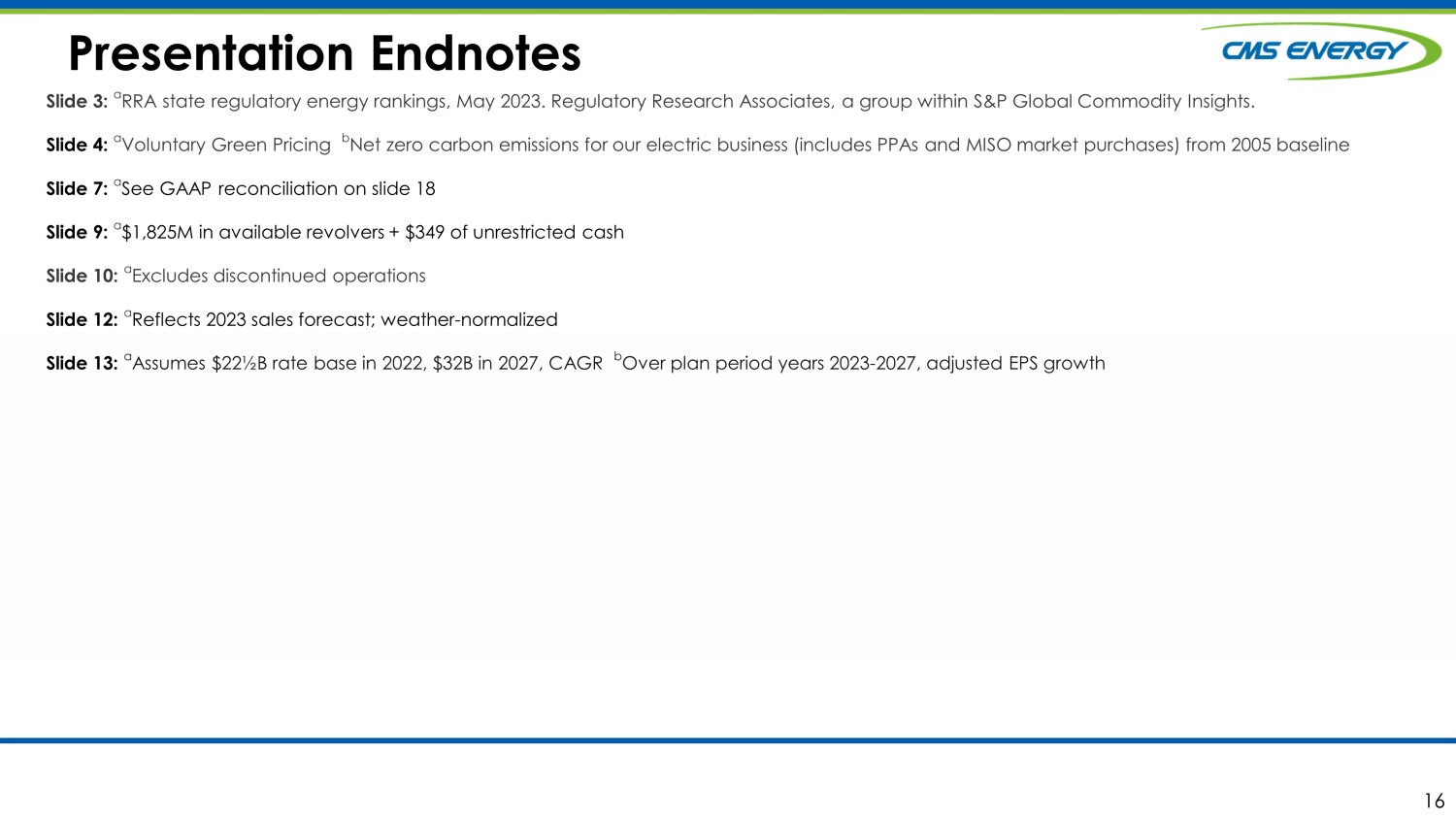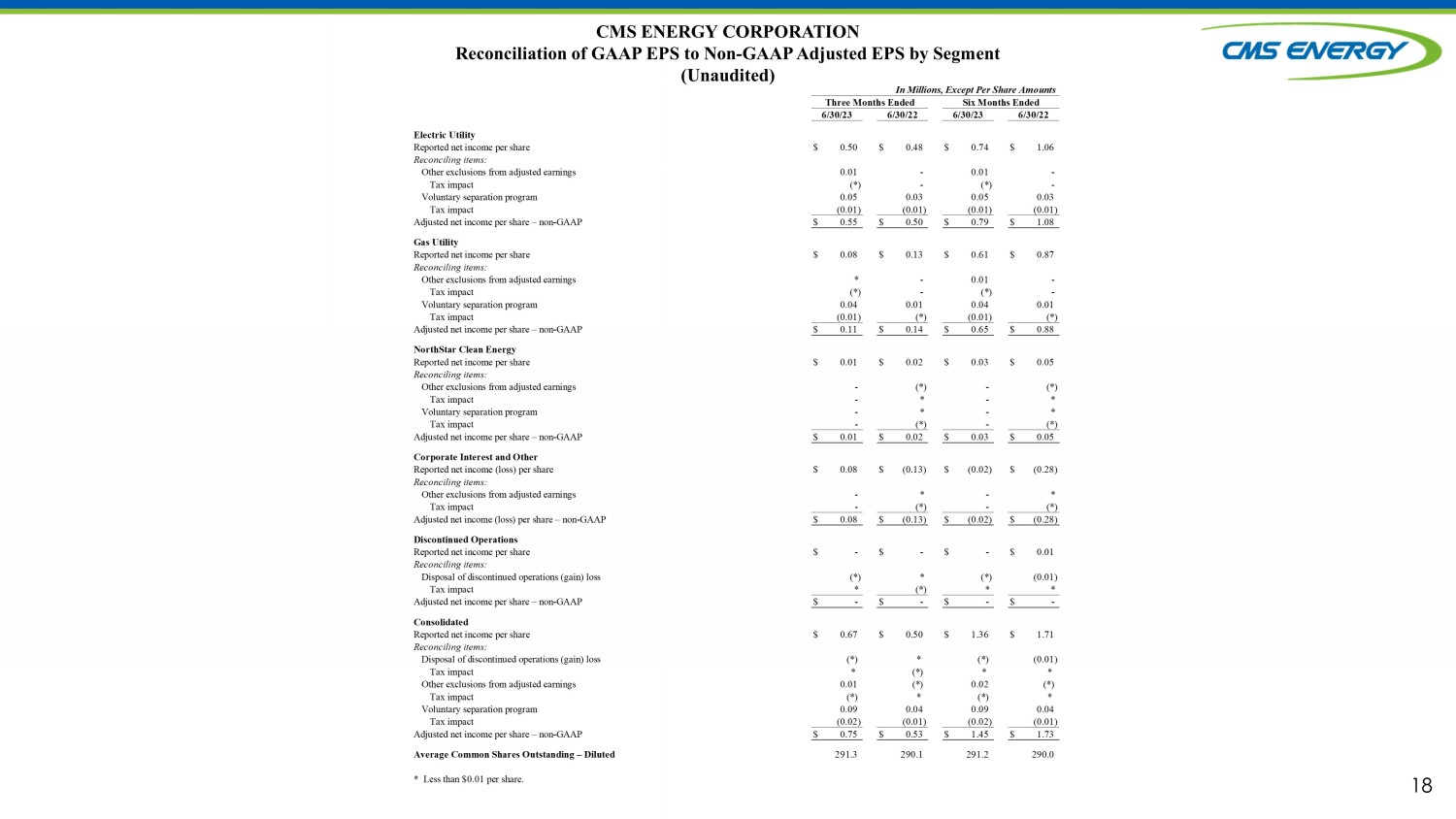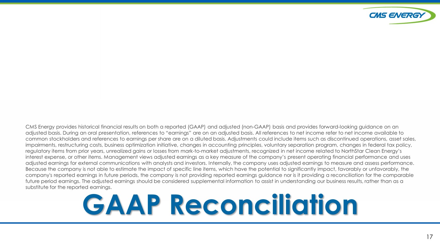 17 17 GAAP Reconciliation CMS Energy provides historical financial results on both a reported (GAAP) and adjusted (non - GAAP) basis and provides forward - lo oking guidance on an adjusted basis. During an oral presentation, references to “earnings” are on an adjusted basis. All references to net income ref er to net income available to common stockholders and references to earnings per share are on a diluted basis. Adjustments could include items such as disc ont inued operations, asset sales, impairments, restructuring costs, business optimization initiative, changes in accounting principles, voluntary separation pr ogr am, changes in federal tax policy, regulatory items from prior years, unrealized gains or losses from mark - to - market adjustments, recognized in net income related to NorthStar Clean Energy’s interest expense, or other items. Management views adjusted earnings as a key measure of the company’s present operating fina nci al performance and uses adjusted earnings for external communications with analysts and investors. Internally, the company uses adjusted earnings to mea sure and assess performance. Because the company is not able to estimate the impact of specific line items, which have the potential to significantly impa ct, favorably or unfavorably, the company's reported earnings in future periods, the company is not providing reported earnings guidance nor is it providing a rec onciliation for the comparable future period earnings. The adjusted earnings should be considered supplemental information to assist in understanding our bu sin ess results, rather than as a substitute for the reported earnings.