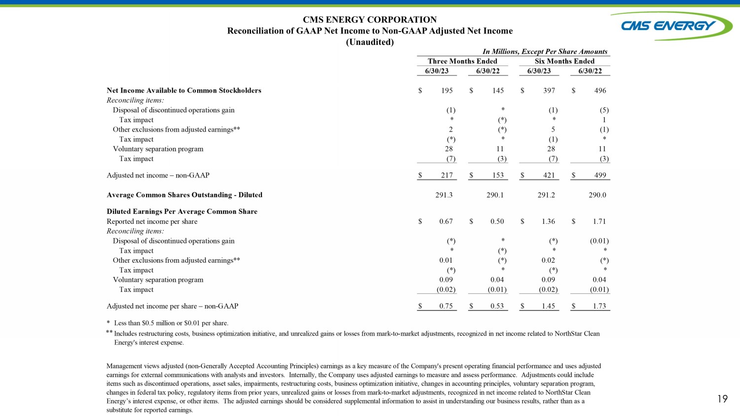 18 CMS ENERGY CORPORATION Reconciliation of GAAP EPS to Non - GAAP Adjusted EPS by Segment (Unaudited) Electric Utility Reported net income per share $ 0.50 $ 0.48 $ 0.74 $ 1.06 Reconciling items: Other exclusions from adjusted earnings 0.01 - 0.01 - Tax impact (*) - (*) - Voluntary separation program 0.05 0.03 0.05 0.03 Tax impact (0.01) (0.01) (0.01) (0.01) Adjusted net income per share – non-GAAP $ 0.55 $ 0.50 $ 0.79 $ 1.08 Gas Utility Reported net income per share $ 0.08 $ 0.13 $ 0.61 $ 0.87 Reconciling items: Other exclusions from adjusted earnings * - 0.01 - Tax impact (*) - (*) - Voluntary separation program 0.04 0.01 0.04 0.01 Tax impact (0.01) (*) (0.01) (*) Adjusted net income per share – non-GAAP $ 0.11 $ 0.14 $ 0.65 $ 0.88 NorthStar Clean Energy Reported net income per share $ 0.01 $ 0.02 $ 0.03 $ 0.05 Reconciling items: Other exclusions from adjusted earnings - (*) - (*) Tax impact - * - * Voluntary separation program - * - * Tax impact - (*) - (*) Adjusted net income per share – non-GAAP $ 0.01 $ 0.02 $ 0.03 $ 0.05 Corporate Interest and Other Reported net income (loss) per share $ 0.08 $ (0.13) $ (0.02) $ (0.28) Reconciling items: Other exclusions from adjusted earnings - * - * Tax impact - (*) - (*) Adjusted net income (loss) per share – non-GAAP $ 0.08 $ (0.13) $ (0.02) $ (0.28) Discontinued Operations Reported net income per share $ - $ - $ - $ 0.01 Reconciling items: Disposal of discontinued operations (gain) loss (*) * (*) (0.01) Tax impact * (*) * * Adjusted net income per share – non-GAAP $ - $ - $ - $ - Consolidated Reported net income per share $ 0.67 $ 0.50 $ 1.36 $ 1.71 Reconciling items: Disposal of discontinued operations (gain) loss (*) * (*) (0.01) Tax impact * (*) * * Other exclusions from adjusted earnings 0.01 (*) 0.02 (*) Tax impact (*) * (*) * Voluntary separation program 0.09 0.04 0.09 0.04 Tax impact (0.02) (0.01) (0.02) (0.01) Adjusted net income per share – non-GAAP $ 0.75 $ 0.53 $ 1.45 $ 1.73 Average Common Shares Outstanding – Diluted 291.3 290.1 291.2 290.0 * Less than $0.01 per share. In Millions, Except Per Share Amounts Three Months Ended Six Months Ended 6/30/23 6/30/22 6/30/23 6/30/22