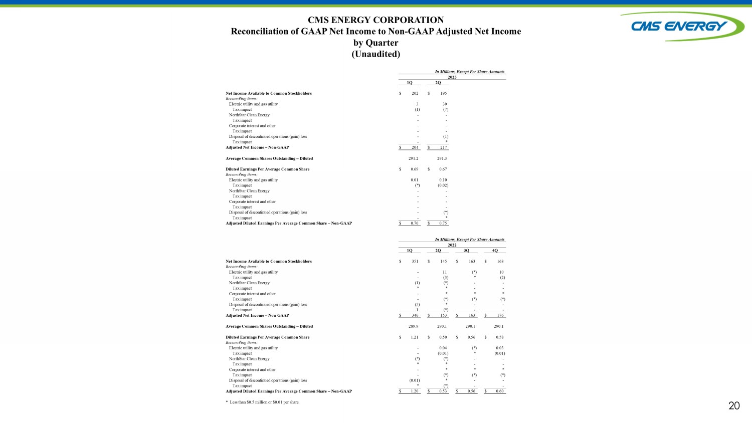 19 CMS ENERGY CORPORATION Reconciliation of GAAP Net Income to Non - GAAP Adjusted Net Income (Unaudited) Net Income Available to Common Stockholders $ 195 $ 145 $ 397 $ 496 Reconciling items: Disposal of discontinued operations gain (1) * (1) (5) Tax impact * (*) * 1 Other exclusions from adjusted earnings** 2 (*) 5 (1) Tax impact (*) * (1) * Voluntary separation program 28 11 28 11 Tax impact (7) (3) (7) (3) Adjusted net income – non-GAAP $ 217 $ 153 $ 421 $ 499 Average Common Shares Outstanding - Diluted 291.3 290.1 291.2 290.0 Diluted Earnings Per Average Common Share Reported net income per share $ 0.67 $ 0.50 $ 1.36 $ 1.71 Reconciling items: Disposal of discontinued operations gain (*) * (*) (0.01) Tax impact * (*) * * Other exclusions from adjusted earnings** 0.01 (*) 0.02 (*) Tax impact (*) * (*) * Voluntary separation program 0.09 0.04 0.09 0.04 Tax impact (0.02) (0.01) (0.02) (0.01) Adjusted net income per share – non-GAAP $ 0.75 $ 0.53 $ 1.45 $ 1.73 * Less than $0.5 million or $0.01 per share. ** Includes restructuring costs, business optimization initiative, and unrealized gains or losses from mark-to-market adjustments, recognized in net income related to NorthStar Clean Energy's interest expense. Management views adjusted (non-Generally Accepted Accounting Principles) earnings as a key measure of the Company's present operating financial performance and uses adjusted earnings for external communications with analysts and investors. Internally, the Company uses adjusted earnings to measure and assess performance. Adjustments could include items such as discontinued operations, asset sales, impairments, restructuring costs, business optimization initiative, changes in accounting principles, voluntary separation program, changes in federal tax policy, regulatory items from prior years, unrealized gains or losses from mark-to-market adjustments, recognized in net income related to NorthStar Clean Energy’s interest expense, or other items. The adjusted earnings should be considered supplemental information to assist in understanding our business results, rather than as a substitute for reported earnings. In Millions, Except Per Share Amounts Three Months Ended Six Months Ended 6/30/23 6/30/22 6/30/23 6/30/22