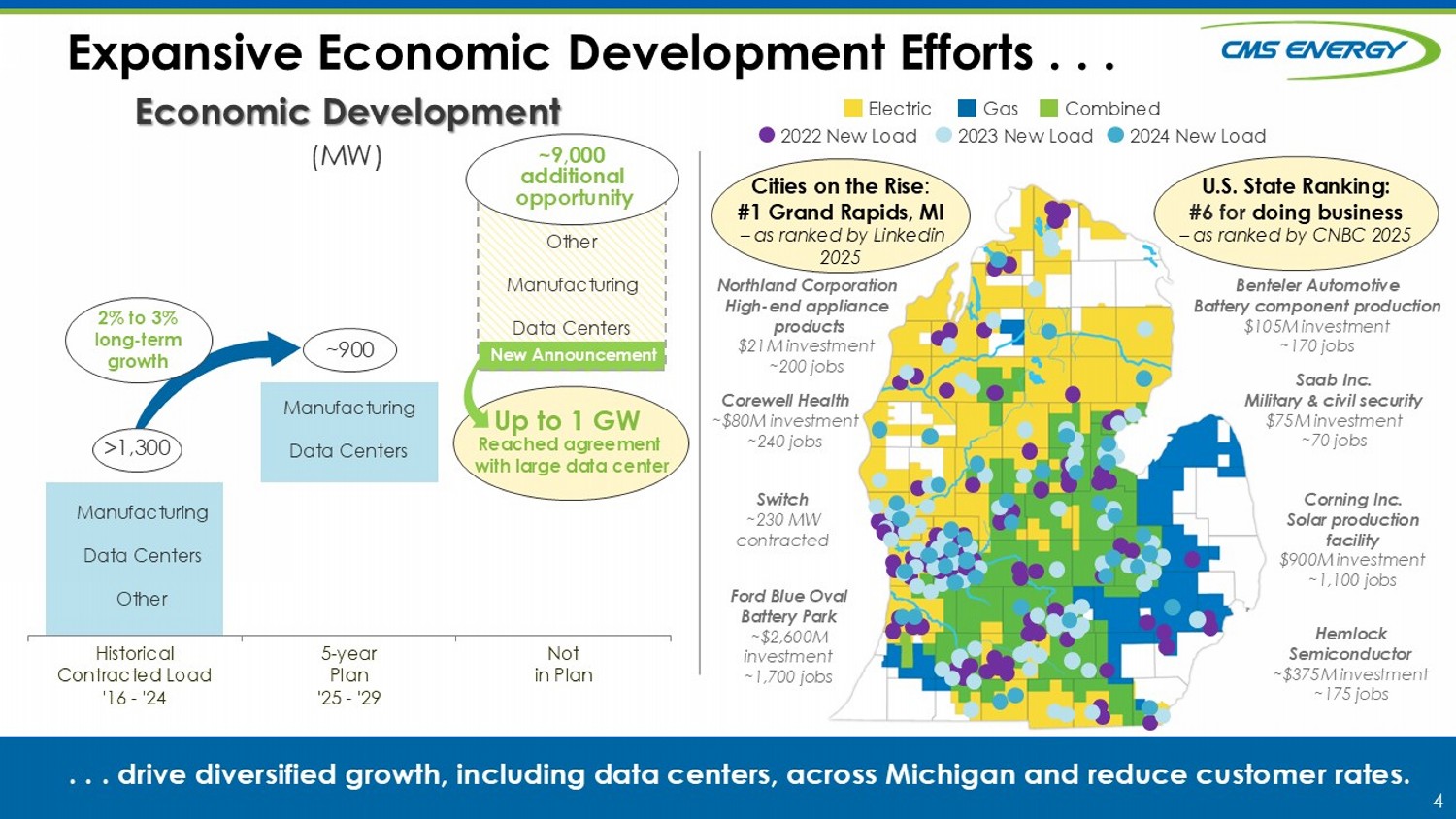 4 Expansive Economic Development Efforts . . . . . . drive diversified growth, including data centers, across Michigan and reduce customer rates. Electric Gas Combined 2022 New Load 2023 New Load 2024 New Load Corning Inc. Solar production facility $900M investment ~1,100 jobs Saab Inc. Military & civil security $75M investment ~70 jobs Northland Corporation High - end appliance products $21M investment ~200 jobs Hemlock Semiconductor ~$375M investment ~175 jobs Ford Blue Oval Battery Park ~$2,600M investment ~1,700 jobs Benteler Automotive Battery component production $105M investment ~170 jobs Corewell Health ~$80M investment ~240 jobs Switch ~230 MW contracted Economic Development (MW) Historical Contracted Load '16 - '24 5-year Plan '25 - '29 Not in Plan >1,300 ~900 2% to 3% l ong - term g rowth Other Manufacturing Data Centers ~9,000 additional opportunity Manufacturing Data Centers Manufacturing Data Centers Other New Announcement Reached agreement with large data center Up to 1 GW Cities on the Rise : #1 Grand Rapids, MI – as ranked by Linkedin 2025 U.S. State Ranking: #6 for doing business – as ranked by CNBC 2025