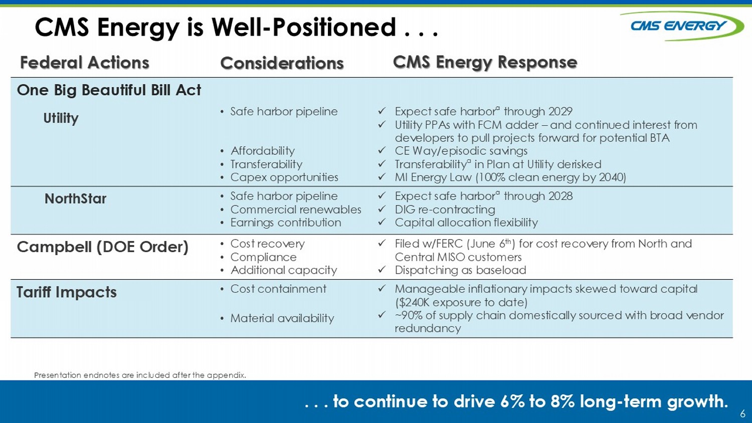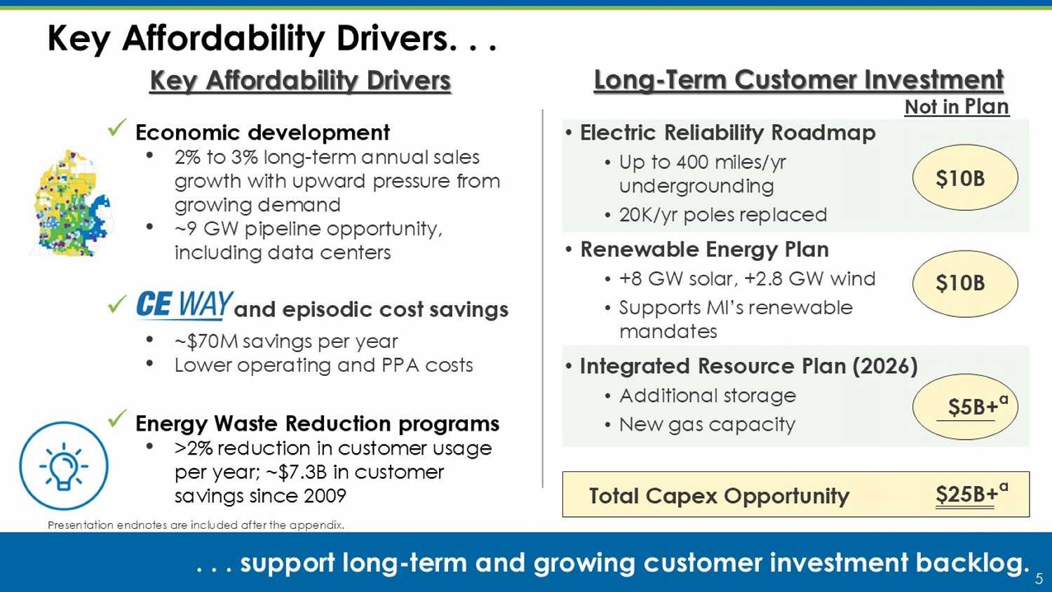 5 Key Affordability Drivers. . . . . . s upport long - term and growing customer investment backlog . Key Affordability Drivers x Economic development • 2% to 3% long - term annual sales growth with upward pressure from growing demand • ~9 GW pipeline opportunity, including data centers x and episodic cost savings • ~$70M savings per year • Lower operating and PPA costs x Energy Waste Reduction programs • >2% reduction in customer usage per year; ~$7.3B in customer savings since 2009 Long - Term Customer Investment • Electric Reliability Roadmap • Up to 400 miles/yr undergrounding • 20K/yr poles replaced • Renewable Energy Plan • +8 GW solar, +2.8 GW wind • Supports MI’s renewable mandates • Integrated Resource Plan (2026) • Additional storage • New gas capacity Total Capex Opportunity Not in Plan $10B $10B $5B+ a $25B+ a Presentation endnotes are included after the appendix.