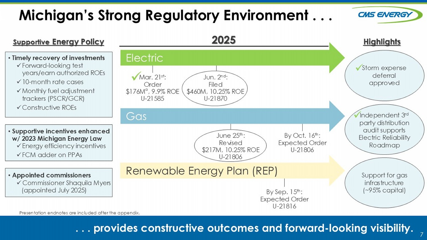 6 CMS Energy is Well - Positioned . . . . . . t o continue to drive 6% to 8% long - term growth . Federal Actions CMS Energy Response One Big Beautiful Bill Act x Expect safe harbor a through 2029 x Utility PPAs with FCM adder – and continued interest from developers to pull projects forward for potential BTA x CE Way/episodic savings x Transferability a in Plan at Utility derisked x MI Energy Law (100% clean energy by 2040) • Safe harbor pipeline • Affordability • Transferability • Capex opportunities Utility x Expect safe harbor a through 2028 x DIG re - contracting x Capital allocation flexibility • Safe harbor pipeline • Commercial renewables • Earnings contribution NorthStar x Filed w/FERC (June 6 th ) for cost recovery from North and Central MISO customers x Dispatching as baseload • Cost recovery • Compliance • Additional capacity Campbell (DOE Order) x Manageable inflationary impacts skewed toward capital ($240K exposure to date) x ~90% of supply chain domestically sourced with broad vendor redundancy • Cost containment • Material availability Tariff Impacts Considerations Presentation endnotes are included after the appendix.