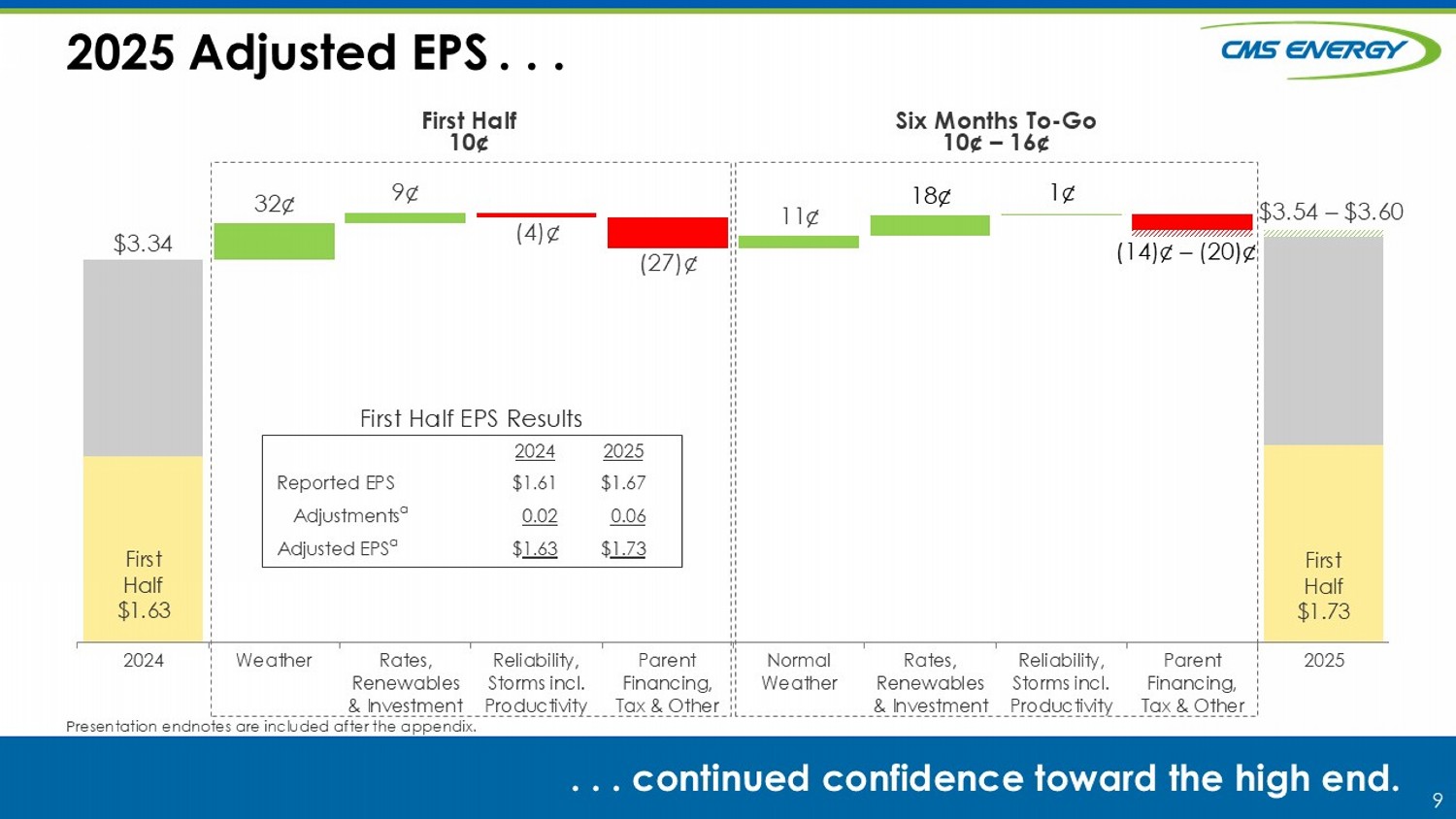 9 2024 Weather Rates, Renewables & Investment Reliability, Storms incl. Productivity Parent Financing, Tax & Other Normal Weather Rates, Renewables & Investment Reliability, Storms incl. Productivity Parent Financing, Tax & Other 2025 2025 Adjusted EPS . . . . . . continued confidence toward the high end. First Half 10¢ Six Months To - Go 10 ¢ – 16 ¢ Presentation endnotes are included after the appendix. $3.54 – $3.60 32 ¢ $3.34 9 ¢ ( 27 )¢ 11 ¢ 18¢ (14) ¢ – (20)¢ (4)¢ 1¢ First Half $1.73 First Half $ 1.63 2025 2024 $1.67 $1.61 Reported EPS 0.06 0.02 Adjustments a $ 1.73 $ 1.63 Adjusted EPS a First Half EPS Results