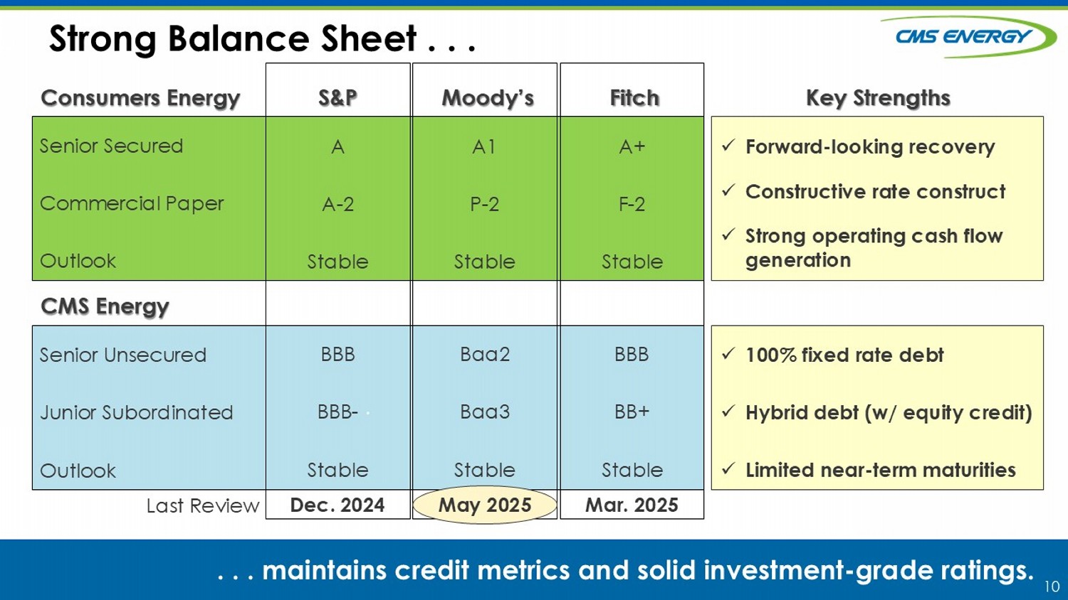 10 . Strong Balance Sheet . . . . . . m aintains credit metrics and solid investment - grade ratings. Consumers Energy CMS Energy Senior Secured Commercial Paper Outlook Senior Unsecured Junior Subordinated Outlook Last Review A1 P - 2 Stable Baa2 Baa3 Stable May 2025 A+ F - 2 Stable BBB BB+ Stable Mar. 2025 S&P Moody’s Fitch x Forward - looking recovery x Constructive rate construct x Strong operating cash flow generation x 100% fixed rate debt x Hybrid debt (w/ equity credit) x Limited near - term maturities Key Strengths A A - 2 Stable BBB BBB - Stable Dec. 2024 Ma y 2025