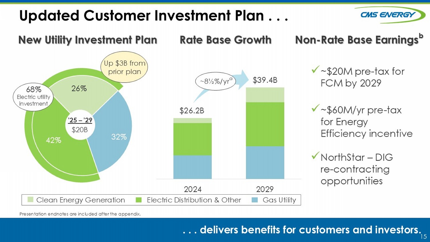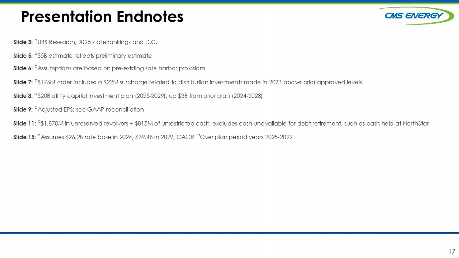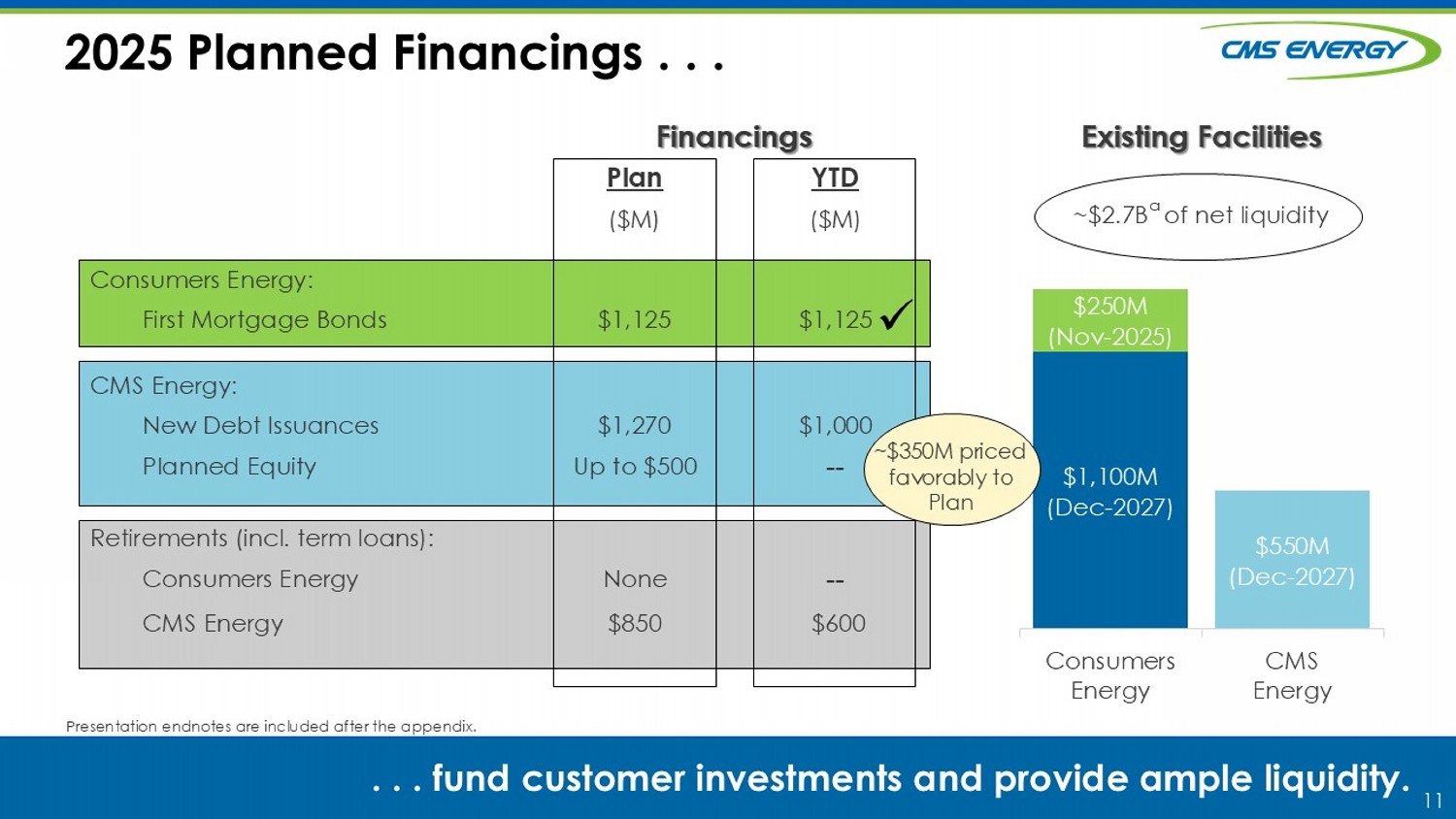 11 YTD Plan ($M) ($M) Consumers Energy: $1,125 $1,125 First Mortgage Bonds CMS Energy: $1,000 $1,270 New Debt Issuances -- Up to $500 Planned Equity Retirements (incl. term loans): -- None Consumers Energy $600 $850 CMS Energy Existing Facilities $1,100M (Dec - 2027) $550M (Dec - 2027) $250M (Nov - 2025) Consumers Energy CMS Energy Financings 2025 Planned Financings . . . . . . fund customer investments and provide ample liquidity. Presentation endnotes are included after the appendix. ~$2.7B a of net liquidity ~$350M priced favorably to Plan x