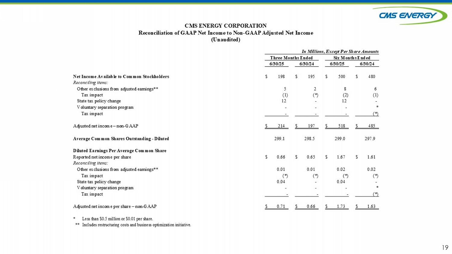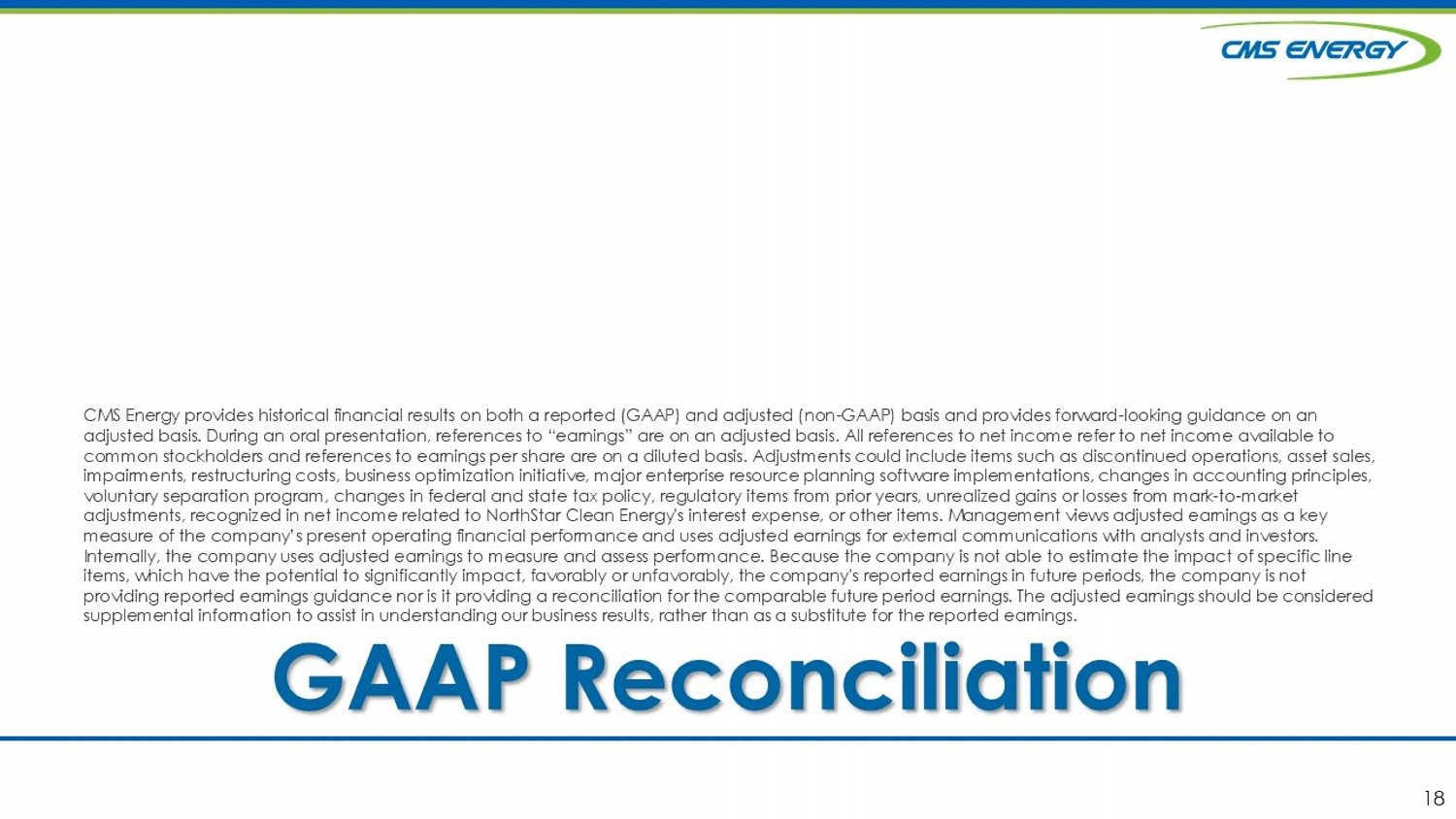 18 GAAP Reconciliation CMS Energy provides historical financial results on both a reported (GAAP) and adjusted (non - GAAP) basis and provides forward - lo oking guidance on an adjusted basis. During an oral presentation, references to “earnings” are on an adjusted basis. All references to net income ref er to net income available to common stockholders and references to earnings per share are on a diluted basis. Adjustments could include items such as disc ont inued operations, asset sales, impairments, restructuring costs, business optimization initiative, major enterprise resource planning software implementatio ns, changes in accounting principles, voluntary separation program, changes in federal and state tax policy, regulatory items from prior years, unrealized gains or lo sses from mark - to - market adjustments, recognized in net income related to NorthStar Clean Energy's interest expense, or other items. Management views adj usted earnings as a key measure of the company’s present operating financial performance and uses adjusted earnings for external communications with ana lysts and investors. Internally, the company uses adjusted earnings to measure and assess performance. Because the company is not able to estimate th e impact of specific line items, which have the potential to significantly impact, favorably or unfavorably, the company's reported earnings in future per iods, the company is not providing reported earnings guidance nor is it providing a reconciliation for the comparable future period earnings. The adju ste d earnings should be considered supplemental information to assist in understanding our business results, rather than as a substitute for the reported earnin gs. 18