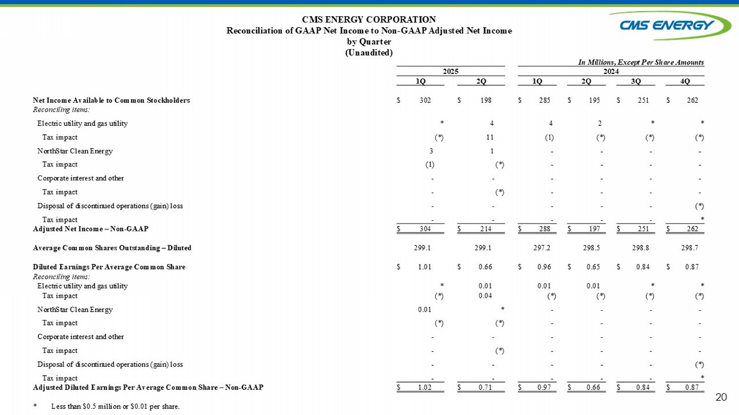 CMS ENERGY CORPORATION Reconciliation of GAAP Net Income to Non - GAAP Adjusted Net Income (Unaudited) 19 In Millions, Except Per Share Amounts Six Months Ended Three Months Ended 6/30/24 6/30/25 6/30/24 6/30/25 480 $ 500 $ 195 $ 198 $ Net Income Available to Common Stockholders Reconciling items: 6 8 2 5 Other exclusions from adjusted earnings** (1) (2) (*) (1) Tax impact - 12 - 12 State tax policy change * - - - Voluntary separation program (*) - - - Tax impact 485 $ 518 $ 197 $ 214 $ Adjusted net income – non - GAAP 297.9 299.0 298.5 299.1 Average Common Shares Outstanding - Diluted Diluted Earnings Per Average Common Share 1.61 $ 1.67 $ 0.65 $ 0.66 $ Reported net income per share Reconciling items: 0.02 0.02 0.01 0.01 Other exclusions from adjusted earnings** (*) (*) (*) (*) Tax impact - 0.04 - 0.04 State tax policy change * - - - Voluntary separation program (*) - - - Tax impact 1.63 $ 1.73 $ 0.66 $ 0.71 $ Adjusted net income per share – non - GAAP Less than $0.5 million or $0.01 per share. * Includes restructuring costs and business optimization initiative. **