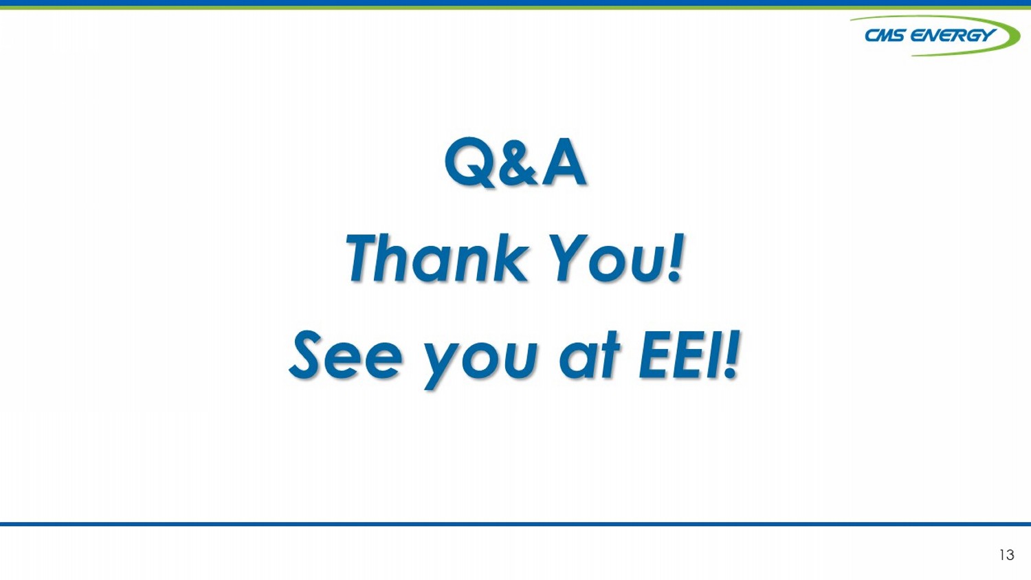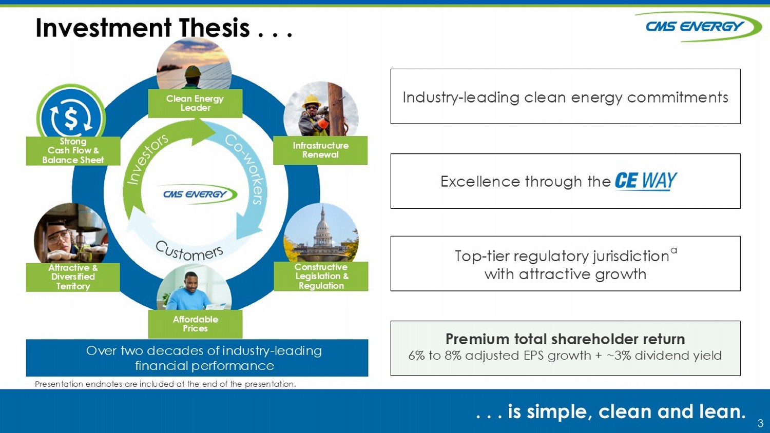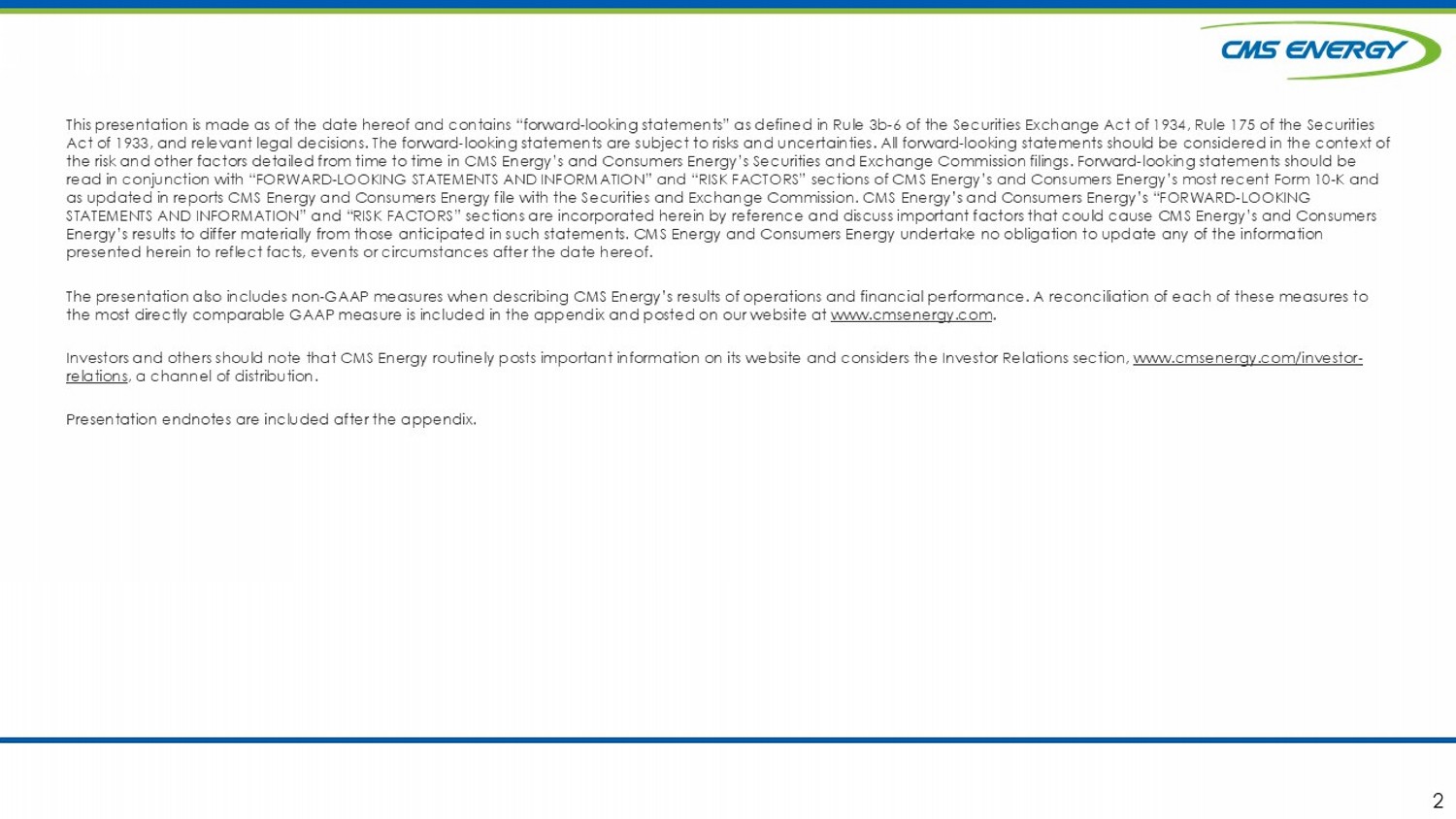 2 Enter “so what” if necessary – Century Gothic, Bold, Size 18 or smaller This presentation is made as of the date hereof and contains “forward - looking statements” as defined in Rule 3b - 6 of the Securit ies Exchange Act of 1934, Rule 175 of the Securities Act of 1933, and relevant legal decisions. The forward - looking statements are subject to risks and uncertainties. All forward - lo oking statements should be considered in the context of the risk and other factors detailed from time to time in CMS Energy’s and Consumers Energy’s Securities and Exchange Commissi on filings. Forward - looking statements should be read in conjunction with “FORWARD - LOOKING STATEMENTS AND INFORMATION” and “RISK FACTORS” sections of CMS Energy’s and Consumers Energy’s most recent Form 10 - K and as updated in reports CMS Energy and Consumers Energy file with the Securities and Exchange Commission. CMS Energy’s and Cons ume rs Energy’s “FORWARD - LOOKING STATEMENTS AND INFORMATION” and “RISK FACTORS” sections are incorporated herein by reference and discuss important factors th at could cause CMS Energy’s and Consumers Energy’s results to differ materially from those anticipated in such statements. CMS Energy and Consumers Energy undertake no ob ligation to update any of the information presented herein to reflect facts, events or circumstances after the date hereof. The presentation also includes non - GAAP measures when describing CMS Energy’s results of operations and financial performance. A reconciliation of each of these measures to the most directly comparable GAAP measure is included in the appendix and posted on our website at www.cmsenergy.com . Investors and others should note that CMS Energy routinely posts important information on its website and considers the Inves tor Relations section, www.cmsenergy.com/investor - relations , a channel of distribution. Presentation endnotes are included after the appendix. 2