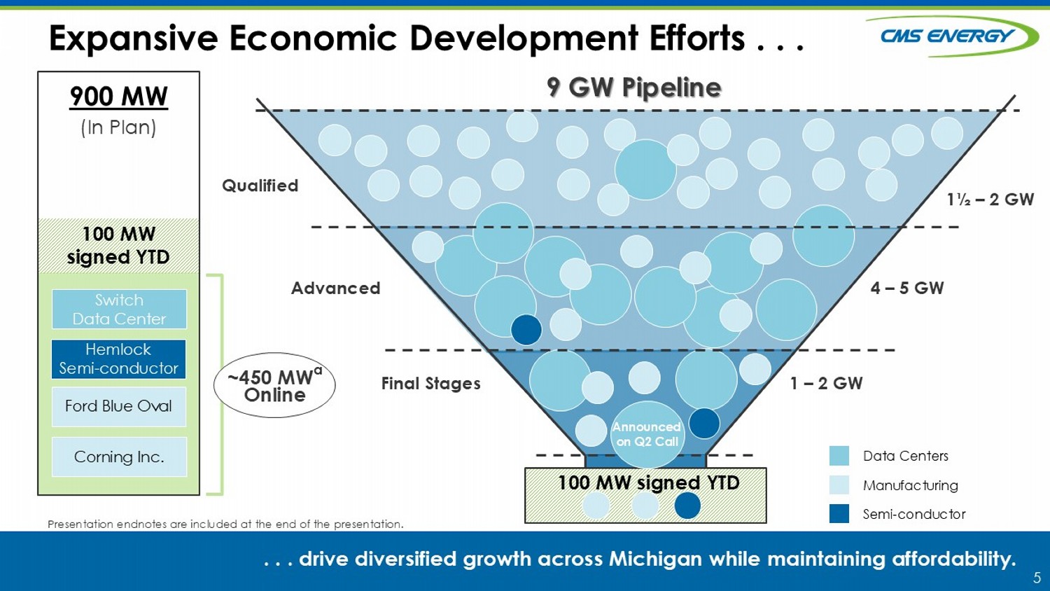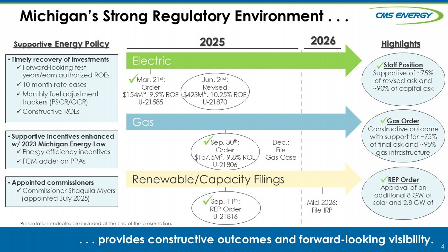 4 Dec.: File Gas Case Michigan’s Strong Regulatory Environment . . . . . . provides constructive outcomes and forward - looking visibility. Electric Gas Supportive Energy Policy • Timely recovery of investments x Forward - looking test years/earn authorized ROEs x 10 - month rate cases x Monthly fuel adjustment trackers (PSCR/GCR) x Constructive ROEs • Supportive incentives enhanced w/ 2023 Michigan Energy Law x Energy efficiency incentives x FCM adder on PPAs • Appointed commissioners x Commissioner Shaquila Myers (appointed July 2025) Renewable/Capacity Filings 2025 Mar. 21 st : Order $154M a , 9.9% ROE U - 21585 x Jun. 2 nd : Revised $423M b , 10.25% ROE U - 21870 Highlights x Staff Position Supportive of ~75% of revised ask and ~90% of capital ask REP Order Approval of an additional 8 GW of solar and 2.8 GW of x Gas Order Constructive outcome with support for ~7 5 % of final ask and ~95% gas infrastructure Sep. 11 th : REP Order U - 21816 x Sep . 30 th : Order $157.5M c , 9.8% ROE U - 21806 x x 2026 Mid - 2026: File IRP Presentation endnotes are included at the end of the presentation.