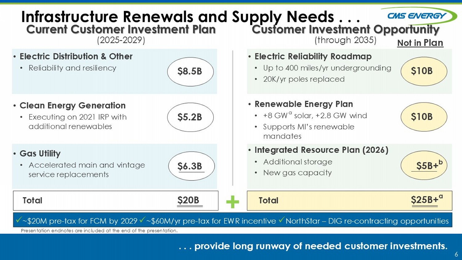 5 Expansive Economic Development Efforts . . . . . . drive diversified growth across Michigan while maintaining affordability. 9 GW Pipeline Data Centers Manufacturing Semi - conductor Advanced Final Stages 4 – 5 GW 1½ – 2 GW 1 – 2 GW Qualified Hemlock Semi - conductor Switch Data Center Ford Blue Oval (In Plan) 900 MW Corning Inc. ~450 MW a Online 100 MW signed YTD 100 MW signed YTD Announced on Q2 Call Presentation endnotes are included at the end of the presentation.