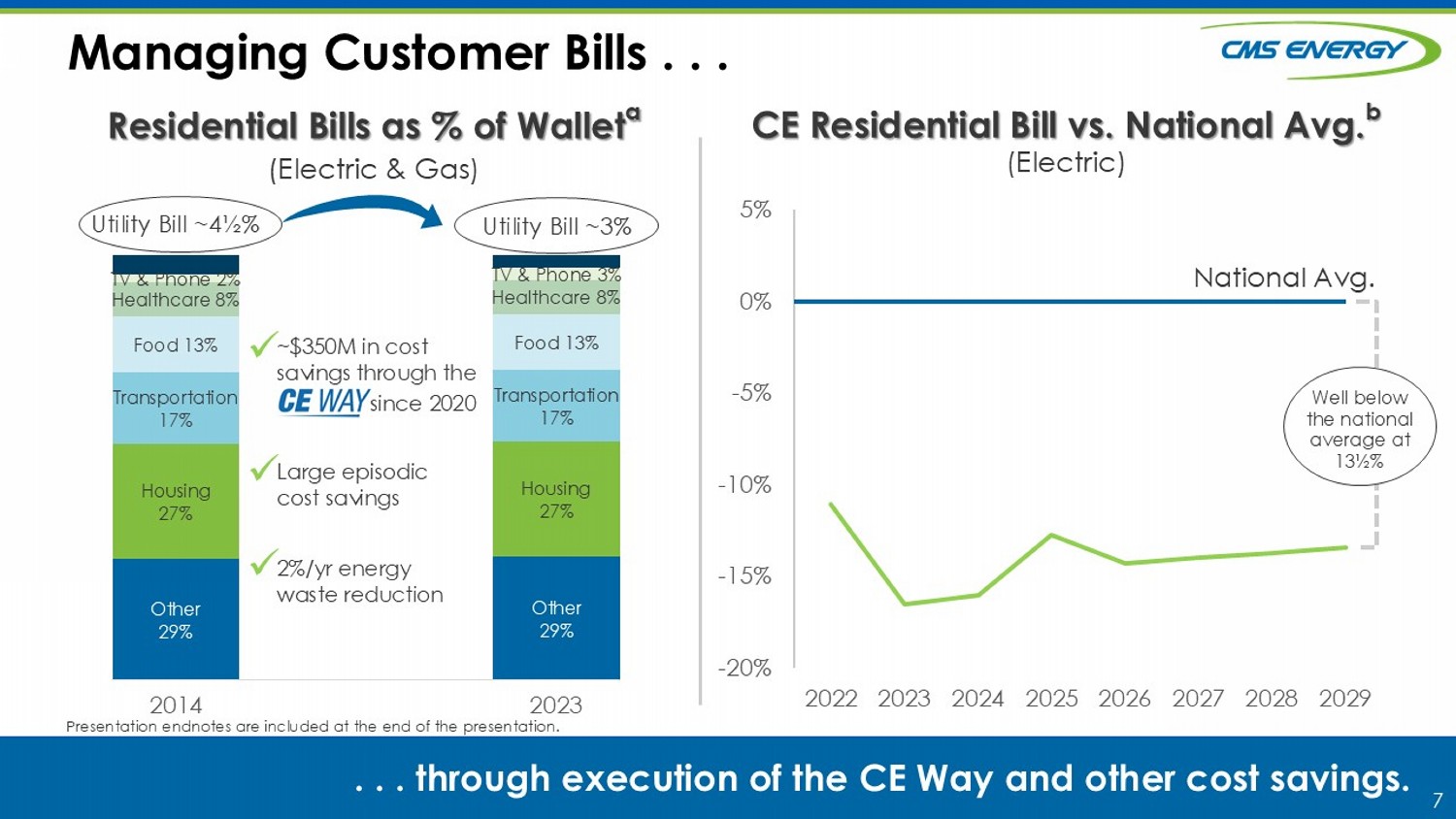 6 $ 8.5 B $5.2B $6.3B $20B Infrastructure Renewals and Supply Needs . . . . . . provide long runway of needed customer investments . Current Customer Investment Plan (2025 - 2029) • Electric Reliability Roadmap • Up to 400 miles/yr undergrounding • 20K/yr poles replaced • Renewable Energy Plan • +8 GW a solar, +2.8 GW wind • Supports MI’s renewable mandates • Integrated Resource Plan (2026) • Additional storage • New gas capacity Total Not in Plan $10B $10B $5B+ b $25B+ a • Electric Distribution & Other • Reliability and resiliency • Clean Energy Generation • Executing on 2021 IRP with additional renewables • Gas Utility • Accelerated main and vintage service replacements Total Customer Investment Opportunity (through 2035) + x ~$20M pre - tax for FCM by 2029 x ~$60M/yr pre - tax for EWR incentive x NorthStar – DIG re - contracting opportunities Presentation endnotes are included at the end of the presentation.
