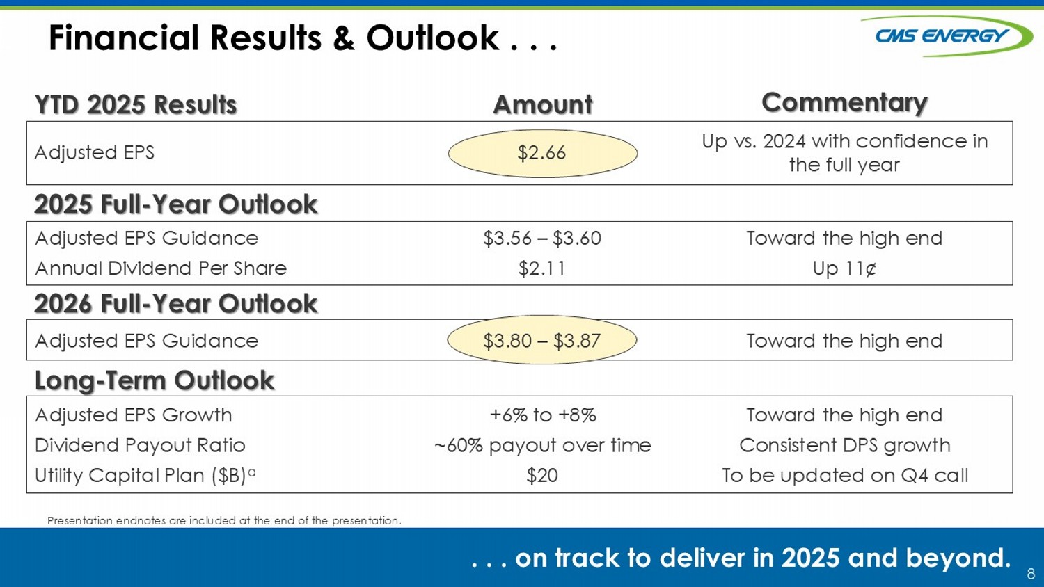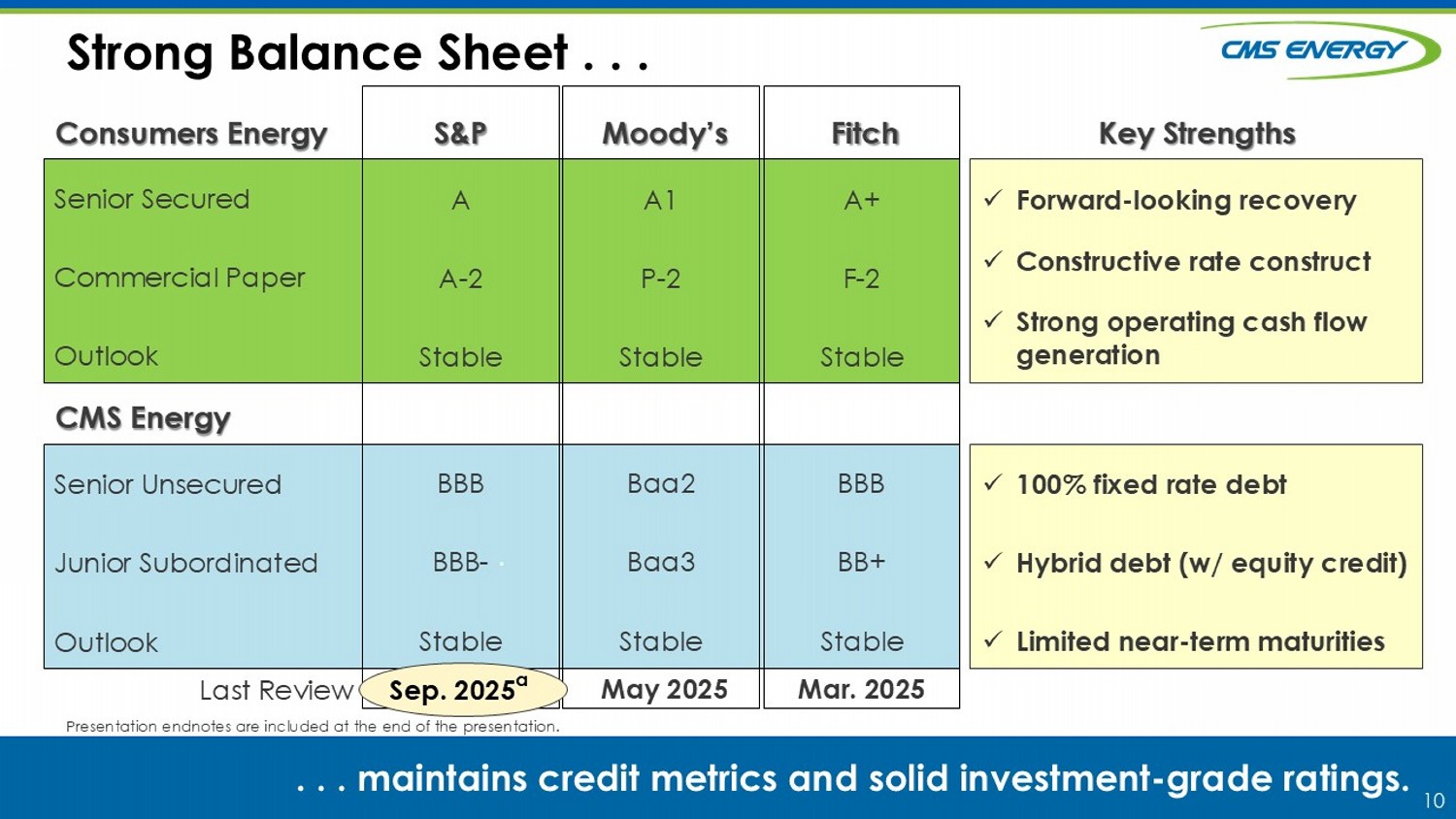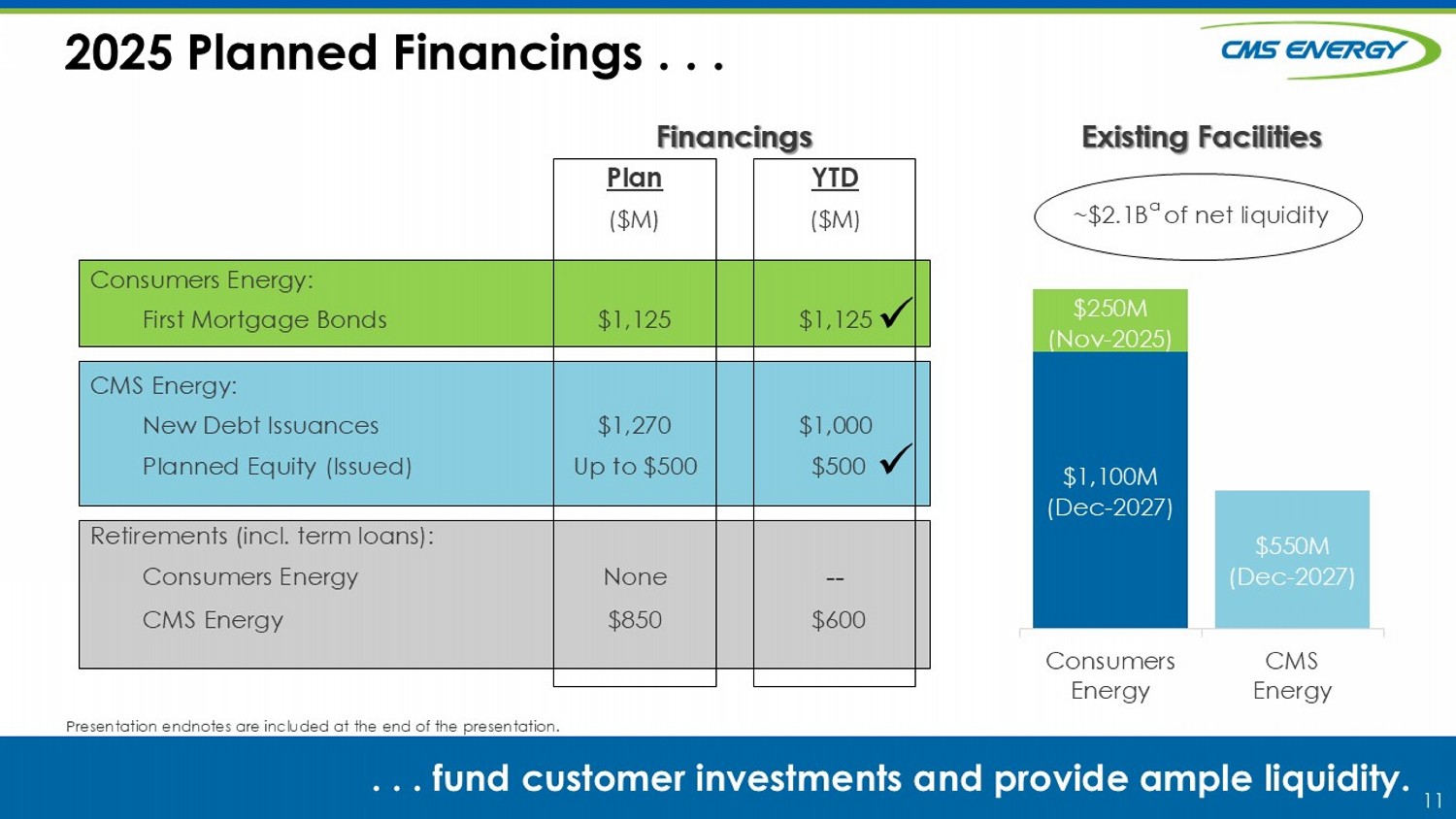 11 YTD Plan ($M) ($M) Consumers Energy: $1,125 $1,125 First Mortgage Bonds CMS Energy: $1,000 $1,270 New Debt Issuances $500 Up to $500 Planned Equity (Issued) Retirements (incl. term loans): -- None Consumers Energy $600 $850 CMS Energy Existing Facilities $1,100M (Dec - 2027) $550M (Dec - 2027) $250M (Nov - 2025) Consumers Energy CMS Energy Financings 2025 Planned Financings . . . . . . fund customer investments and provide ample liquidity. ~$2.1B a of net liquidity x x Presentation endnotes are included at the end of the presentation.