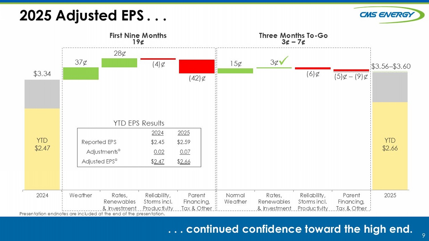8 . . . on track to deliver in 2025 and beyond. Commentary Amount Financial Results & Outlook . . . YTD 2025 Results ` Long - Term Outlook 2025 Full - Year Outlook 2026 Full - Year Outlook Adjusted EPS $2 .66 Up vs. 2024 with confidence in the full year Adjusted EPS Guidance Annual Dividend Per Share $3.56 – $3.60 $2.11 Toward the high end Up 11¢ Adjusted EPS Guidance $3.80 – $3. 87 Toward the high end Adjusted EPS Growth Dividend Payout Ratio Utility Capital Plan ($B) a +6% to +8% ~60% payout over time $ 20 Toward the high end Consistent DPS growth To be updated on Q4 call Presentation endnotes are included at the end of the presentation.