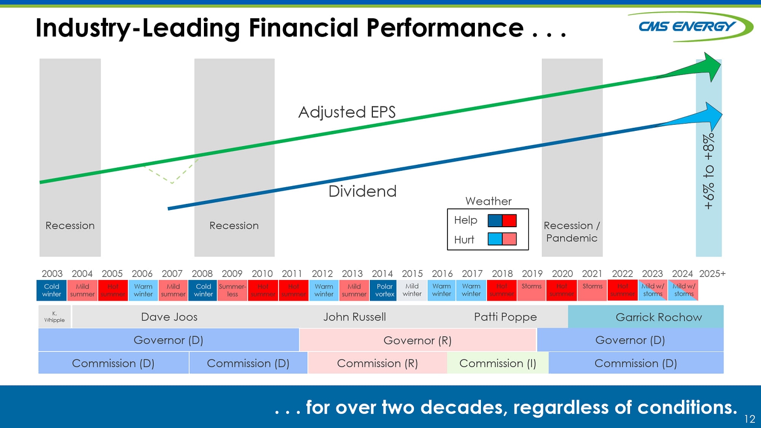 12 Recession Industry - Leading Financial Performance . . . . . . for over two decades, regardless of conditions. 2003 2004 2005 2006 2007 2008 2009 2010 2011 2012 2013 2014 2015 2016 2017 2018 2019 2020 2021 2022 2023 2024 2025+ Recession Adjusted EPS Dividend +6% to +8% Weather Help Hurt Cold winter Mild summer Warm winter Hot summer Mild summer Cold winter Polar vortex Mild summer Warm winter Hot summer Hot summer Summer - less Storms Hot summer Storms Hot summer Warm winter Warm winter Mild winter Governor (D) Governor (R) Governor (D) Commission (D) Commission (D) Commission (R) Commission (I) Commission (D) Dave Joos John Russell Patti Poppe K. Whipple Recession / Pandemic Garrick Rochow Mild w/ storms Hot summer Mild w/ storms