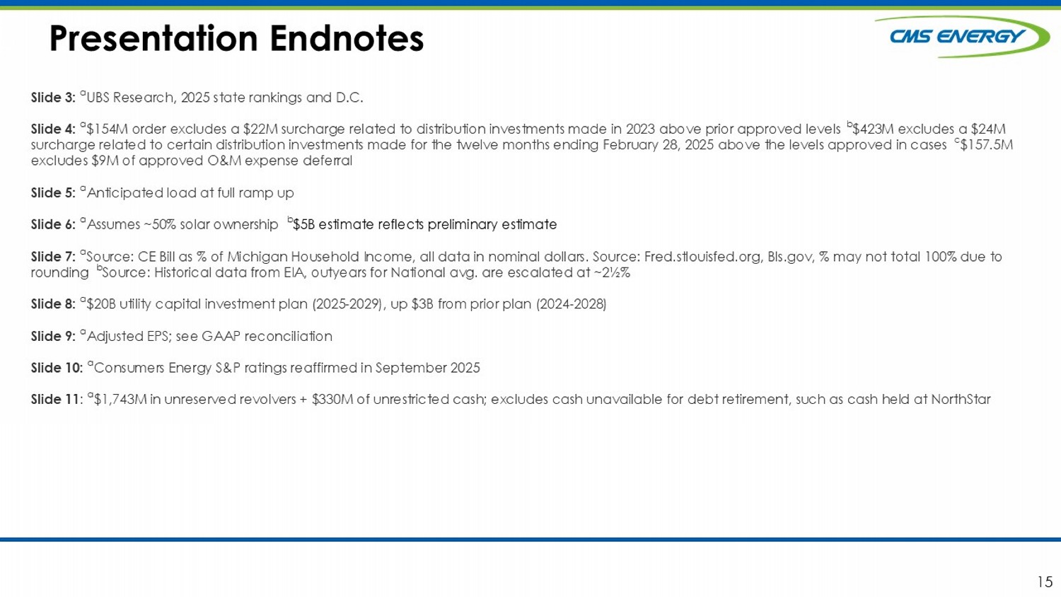 15 Presentation Endnotes Slide 3: a UBS Research, 2025 state rankings and D.C. Slide 4: a $154M order excludes a $22M surcharge related to distribution investments made in 2023 above prior approved levels b $423M excludes a $24M surcharge related to certain distribution investments made for the twelve months ending February 28, 2025 above the levels ap pro ved in cases c $157.5M excludes $9M of approved O&M expense deferral Slide 5: a Anticipated load at full ramp up Slide 6: a Assumes ~50% solar ownership b $5B estimate reflects preliminary estimate Slide 7: a Source : CE Bill as % of Michigan Household Income, all data in nominal dollars. Source: Fred.stlouisfed.org, Bls.gov, % may not tot al 100% due to rounding b Source : Historical data from EIA, outyears for National avg. are escalated at ~2½% Slide 8: a $20B utility capital investment plan (2025 - 2029), up $3B from prior plan (2024 - 2028) Slide 9: a Adjusted EPS; see GAAP reconciliation Slide 10: a Consumers Energy S&P ratings reaffirmed in September 2025 Slide 11 : a $1,743M in unreserved revolvers + $330M of unrestricted cash; excludes cash unavailable for debt retirement, such as cash hel d a t NorthStar 15
