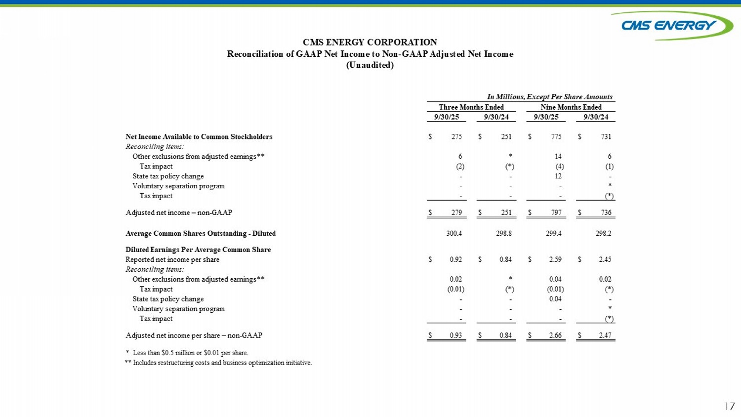 16 GAAP Reconciliation CMS Energy provides historical financial results on both a reported (GAAP) and adjusted (non - GAAP) basis and provides forward - lo oking guidance on an adjusted basis. During an oral presentation, references to “earnings” are on an adjusted basis. All references to net income ref er to net income available to common stockholders and references to earnings per share are on a diluted basis. Adjustments could include items such as disc ont inued operations, asset sales, impairments, restructuring costs, business optimization initiative, major enterprise resource planning software implementatio ns, changes in accounting principles, voluntary separation program, changes in federal and state tax policy, regulatory items from prior years, unrealized gains or lo sses from mark - to - market adjustments, recognized in net income related to NorthStar Clean Energy's interest expense, or other items. Management views adj usted earnings as a key measure of the company’s present operating financial performance and uses adjusted earnings for external communications with ana lysts and investors. Internally, the company uses adjusted earnings to measure and assess performance. Because the company is not able to estimate th e impact of specific line items, which have the potential to significantly impact, favorably or unfavorably, the company's reported earnings in future per iods, the company is not providing reported earnings guidance nor is it providing a reconciliation for the comparable future period earnings. The adju ste d earnings should be considered supplemental information to assist in understanding our business results, rather than as a substitute for the reported earnin gs. 16