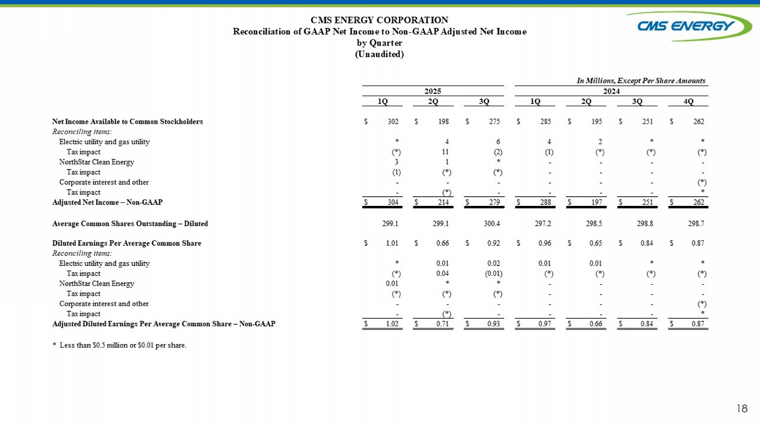 CMS ENERGY CORPORATION Reconciliation of GAAP Net Income to Non - GAAP Adjusted Net Income (Unaudited) 17 Net Income Available to Common Stockholders $ 275 $ 251 $ 775 $ 731 Reconciling items: Other exclusions from adjusted earnings** 6 * 14 6 Tax impact (2) (*) (4) (1) State tax policy change - - 12 - Voluntary separation program - - - * Tax impact - - - (*) Adjusted net income – non-GAAP $ 279 $ 251 $ 797 $ 736 Average Common Shares Outstanding - Diluted 300.4 298.8 299.4 298.2 Diluted Earnings Per Average Common Share Reported net income per share $ 0.92 $ 0.84 $ 2.59 $ 2.45 Reconciling items: Other exclusions from adjusted earnings** 0.02 * 0.04 0.02 Tax impact (0.01) (*) (0.01) (*) State tax policy change - - 0.04 - Voluntary separation program - - - * Tax impact - - - (*) Adjusted net income per share – non-GAAP $ 0.93 $ 0.84 $ 2.66 $ 2.47 * Less than $0.5 million or $0.01 per share. **Includes restructuring costs and business optimization initiative. In Millions, Except Per Share Amounts Three Months Ended Nine Months Ended 9/30/25 9/30/24 9/30/25 9/30/24