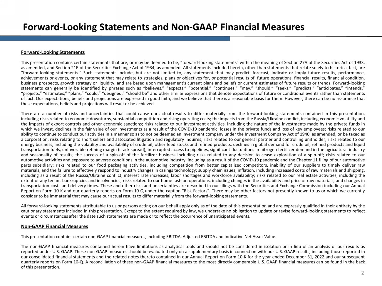2 Forward - Looking Statements and Non - GAAP Financial Measures Forward - Looking Statements This presentation contains certain statements that are, or may be deemed to be, “forward - looking statements” within the meaning of Section 27 A of the Securities Act of 1933 , as amended, and Section 21 E of the Securities Exchange Act of 1934 , as amended . All statements included herein, other than statements that relate solely to historical fact, are “forward - looking statements . ” Such statements include, but are not limited to, any statement that may predict, forecast, indicate or imply future results, performance, achievements or events, or any statement that may relate to strategies, plans or objectives for, or potential results of, future operations, financial results, financial condition, business prospects, growth strategy or liquidity, and are based upon management’s current plans and beliefs or current estimates of future results or trends . Forward - looking statements can generally be identified by phrases such as “believes,” “expects,” “potential,” “continues,” “may,” “should,” “seeks,” “predicts,” “anticipates,” “intends,” “projects,” “estimates,” “plans,” “could,” “designed,” “should be” and other similar expressions that denote expectations of future or conditional events rather than statements of fact . Our expectations, beliefs and projections are expressed in good faith, and we believe that there is a reasonable basis for them . However, there can be no assurance that these expectations, beliefs and projections will result or be achieved . There are a number of risks and uncertainties that could cause our actual results to differ materially from the forward - looking statements contained in this presentation, including risks related to economic downturns, substantial competition and rising operating costs ; the impacts from the Russia/Ukraine conflict, including economic volatility and the impacts of export controls and other economic sanctions ; risks related to our investment activities, including the nature of the investments made by the private funds in which we invest, declines in the fair value of our investments as a result of the COVID - 19 pandemic, losses in the private funds and loss of key employees ; risks related to our ability to continue to conduct our activities in a manner so as to not be deemed an investment company under the Investment Company Act of 1940 , as amended, or be taxed as a corporation ; risks relating to short sellers and associated litigation and regulatory inquires ; risks related to our general partner and controlling unitholder ; risks related to our energy business, including the volatility and availability of crude oil, other feed stocks and refined products, declines in global demand for crude oil, refined products and liquid transportation fuels, unfavorable refining margin (crack spread), interrupted access to pipelines, significant fluctuations in nitrogen fertilizer demand in the agricultural industry and seasonality of results ; the success of a spin - off of the fertilizer business including risks related to any decision to cease exploration of a spin - off ; risks related to our automotive activities and exposure to adverse conditions in the automotive industry, including as a result of the COVID - 19 pandemic and the Chapter 11 filing of our automotive parts subsidiary ; risks related to our food packaging activities, including competition from better capitalized competitors, inability of our suppliers to timely deliver raw materials, and the failure to effectively respond to industry changes in casings technology ; supply chain issues ; inflation, including increased costs of raw materials and shipping, including as a result of the Russia/Ukraine conflict ; interest rate increases ; labor shortages and workforce availability ; risks related to our real estate activities, including the extent of any tenant bankruptcies and insolvencies ; risks related to our home fashion operations, including changes in the availability and price of raw materials, and changes in transportation costs and delivery times . These and other risks and uncertainties are described in our filings with the Securities and Exchange Commission including our Annual Report on Form 10 - K and our quarterly reports on Form 10 - Q under the caption “Risk Factors” . There may be other factors not presently known to us or which we currently consider to be immaterial that may cause our actual results to differ materially from the forward - looking statements . All forward - looking statements attributable to us or persons acting on our behalf apply only as of the date of this presentation and are expressly qualified in their entirety by the cautionary statements included in this presentation . Except to the extent required by law, we undertake no obligation to update or revise forward - looking statements to reflect events or circumstances after the date such statements are made or to reflect the occurrence of unanticipated events . Non - GAAP Financial Measures This presentation contains certain non - GAAP financial measures, including EBITDA, Adjusted EBITDA and Indicative Net Asset Value . The non - GAAP financial measures contained herein have limitations as analytical tools and should not be considered in isolation or in lieu of an analysis of our results as reported under U . S . GAAP . These non - GAAP measures should be evaluated only on a supplementary basis in connection with our U . S . GAAP results, including those reported in our consolidated financial statements and the related notes thereto contained in our Annual Report on Form 10 - K for the year ended December 31 , 2022 and our subsequent quarterly reports on Form 10 - Q . A reconciliation of these non - GAAP financial measures to the most directly comparable U . S . GAAP financial measures can be found in the back o