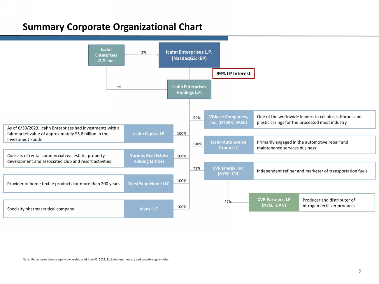 4 Overview of Icahn Enterprises (1) Investment segment total assets represents total equity (equity attributable to IEP was $3.8 billion). (2) All Other operating segments includes Food Packaging, Home Fashion, and Pharma. • Icahn Enterprises L . P . (IEP) is a diversified holding company with operating segments in Investment, Energy, Automotive, Real Estate, Food Packaging, Home Fashion and Pharma • IEP is majority owned and controlled by Carl Icahn • Over many years, Carl Icahn has contributed most of his businesses to and executed transactions primarily through IEP • As of June 30, 2023, Carl Icahn and his affiliates owned approximately 85% of IEP’s outstanding depositary units • IEP has declared 73 consecutive quarterly distributions since 2005 . As of August 10 , 2023 , IEP has a $ 4 . 00 annualized distribution, which is a 16 . 2 % yield • IEP has liquidity through its investment in the Investment Funds of approximately $ 3 . 8 billion as of June 30 , 2023 Investment (1) $6,881 ($1,235) ($671) ($590) Energy 4,801 9,924 351 694 Automotive 1,974 2,097 (158) 11 Real Estate 519 117 6 18 All Other (2) 983 710 (26) 58 Holding Company 2,049 73 (419) (25) $17,207 $11,686 ($917) $166 ($Millions) As of June 30, 2023 Twelve Months Ended June 30, 2023 Assets Total Revenue Net Income (Loss) Attributable to IEP Adjusted EBITDA Attributable to IEP