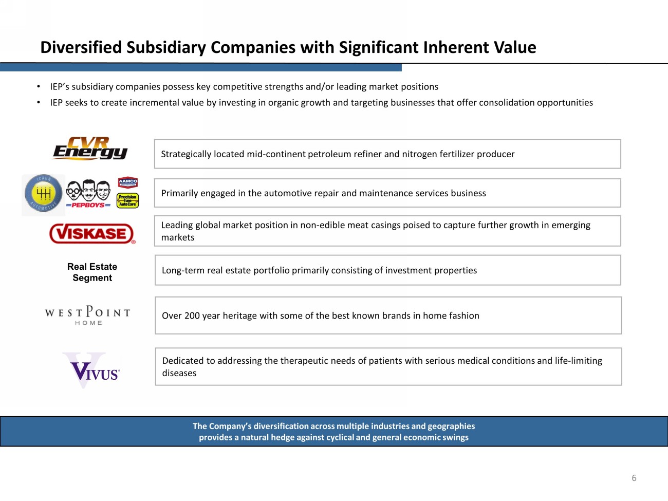 5 Summary Corporate Organizational Chart Note: Percentages denote equity ownership as of June 30, 2023. Excludes intermediary and pass - through entities. CVR Energy , Inc. (NYSE: CVI) Vivus LLC Various Real Estate Holding Entities WestPoint Home LLC Icahn Enterprises G.P. Inc. Icahn Enterprises L.P. ( NasdaqGS : IEP) Icahn Enterprises Holdings L.P. 1% 1% 99% LP Interest 90 % 71% Icahn Capital LP Viskase Companies , Inc. (OTCPK: VKSC) As of 6/30 /20 23 , Icahn Enterprises had investments with a fair market value of approximately $ 3 . 8 billion in the Investment Funds Consists of rental commercial real estate, property development and associated club and resort activities Provider of home textile products for more than 200 years Specialty pharmaceutical company One of the worldwide leaders in cellulosic, fibrous and plastic casings for the processed meat industry Independent refiner and marketer of transportation fuels 100% 100% 100% 100% Icahn Automotive Group LLC Primarily e ngaged in the automotive repair and maintenance services business 100% Producer and distributer of nitrogen fertilizer products CVR Partners, LP (NYSE: UAN) 3 7 %