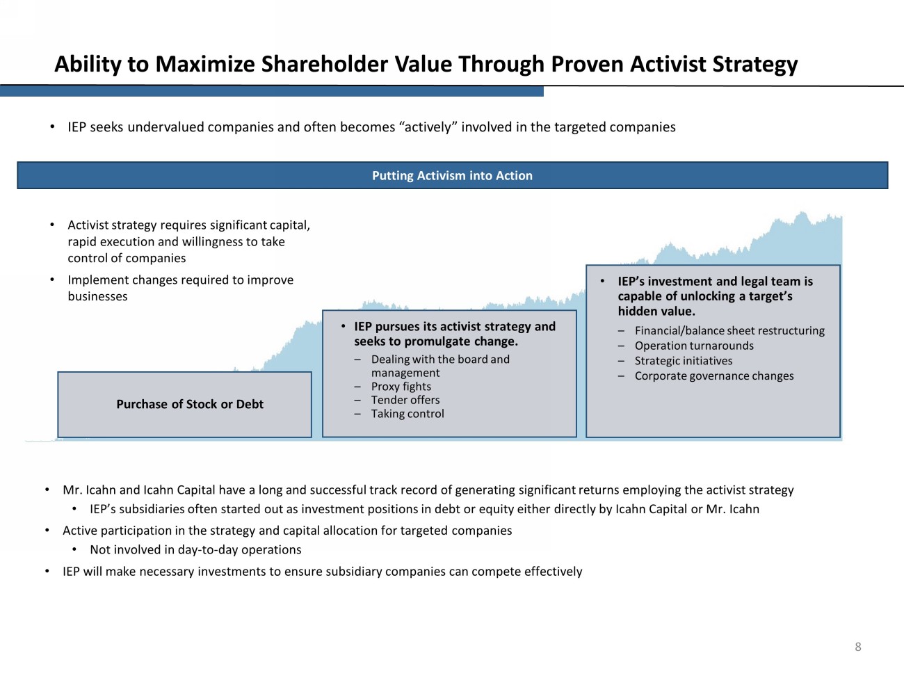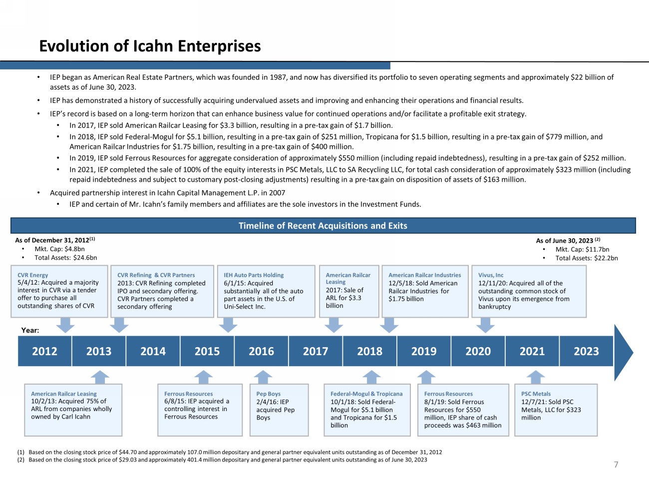 7 Evolution of Icahn Enterprises • IEP began as American Real Estate Partners, which was founded in 1987, and now has diversified its portfolio to seven operati ng segments and approximately $22 billion of assets as of June 30, 2023. • IEP has demonstrated a history of successfully acquiring undervalued assets and improving and enhancing their operations and fin ancial results. • IEP’s record is based on a long - term horizon that can enhance business value for continued operations and/or facilitate a profit able exit strategy. • In 2017, IEP sold American Railcar Leasing for $3.3 billion, resulting in a pre - tax gain of $1.7 billion. • In 2018, IEP sold Federal - Mogul for $5.1 billion, resulting in a pre - tax gain of $251 million, Tropicana for $1.5 billion, resul ting in a pre - tax gain of $779 million, and American Railcar Industries for $1.75 billion, resulting in a pre - tax gain of $400 million. • In 2019, IEP sold Ferrous Resources for aggregate consideration of approximately $550 million (including repaid indebtedness) , r esulting in a pre - tax gain of $252 million. • In 2021, IEP completed the sale of 100% of the equity interests in PSC Metals, LLC to SA Recycling LLC, for total cash consid era tion of approximately $323 million (including repaid indebtedness and subject to customary post - closing adjustments) resulting in a pre - tax gain on disposition of assets of $ 163 million. • Acquired partnership interest in Icahn Capital Management L.P. in 2007 • IEP and certain of Mr. Icahn’s family members and affiliates are the sole investors in the Investment Funds. Timeline of Recent Acquisitions and Exits (1) Based on the closing stock price of $44.70 and approximately 107.0 million depositary and general partner equivalent units outstanding a s of December 31, 2012 (2) Based on the closing stock price of $29.03 and approximately 401.4 million depositary and general partner equivalent un its outstanding as of June 30, 2023 As of December 31, 20 12 (1) • Mkt. Cap: $4.8 bn • Total Assets: $ 24.6 bn As of June 30, 2023 ( 2 ) • Mkt. Cap: $ 11.7b n • Total Assets: $ 22.2 bn Year: 201 2 201 3 2014 201 5 201 6 201 7 201 8 201 9 20 20 20 21 2023 American Railcar Leasing 10/2/13: Acquired 75% of ARL from companies wholly owned by Carl Icahn Ferrous Resources 6/8/15: IEP acquired a controlling interest in Ferrous Resources Pep Boys 2/4/16: IEP acquired Pep Boys Federal - Mogul & Tropicana 10/1/18: Sold Federal - Mogul for $5.1 billion and Tropicana for $1.5 billion Ferrous Resources 8/1/19: Sold Ferrous Resources for $550 million, IEP share of cash proceeds was $4 63 million PSC Metals 12/7/21: Sold PSC Metals, LLC for $323 million CVR Energy 5/4/12: Acquired a majority interest in CVR via a tender offer to purchase all outstanding shares of CVR CVR Refining & CVR Partners 2013: CVR Refining completed IPO and secondary offering. CVR Partners completed a secondary offering IEH Auto Parts Holding 6/1/15: Acquired substantially all of the auto part assets in the U.S. of Uni - Select Inc. American Railcar Leasing 2017: Sale of ARL for $3 .3 billion American Railcar Industries 12/5/18: Sold American Railcar Industries for $1.75 billion Vivus , Inc 12/11/20: Acquired all of the outstanding common stock of Vivus upon its emergence from bankruptcy