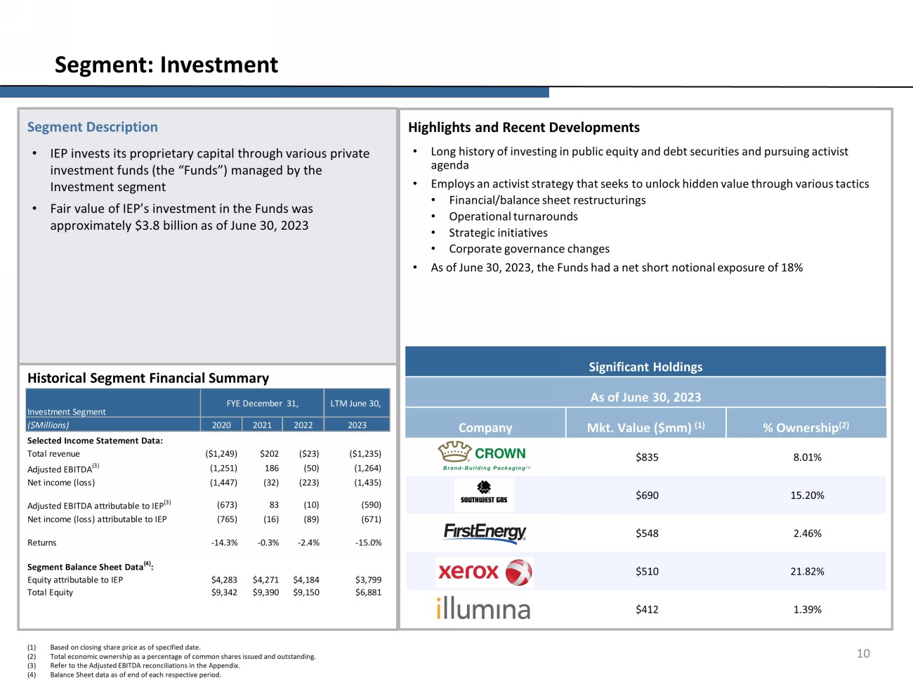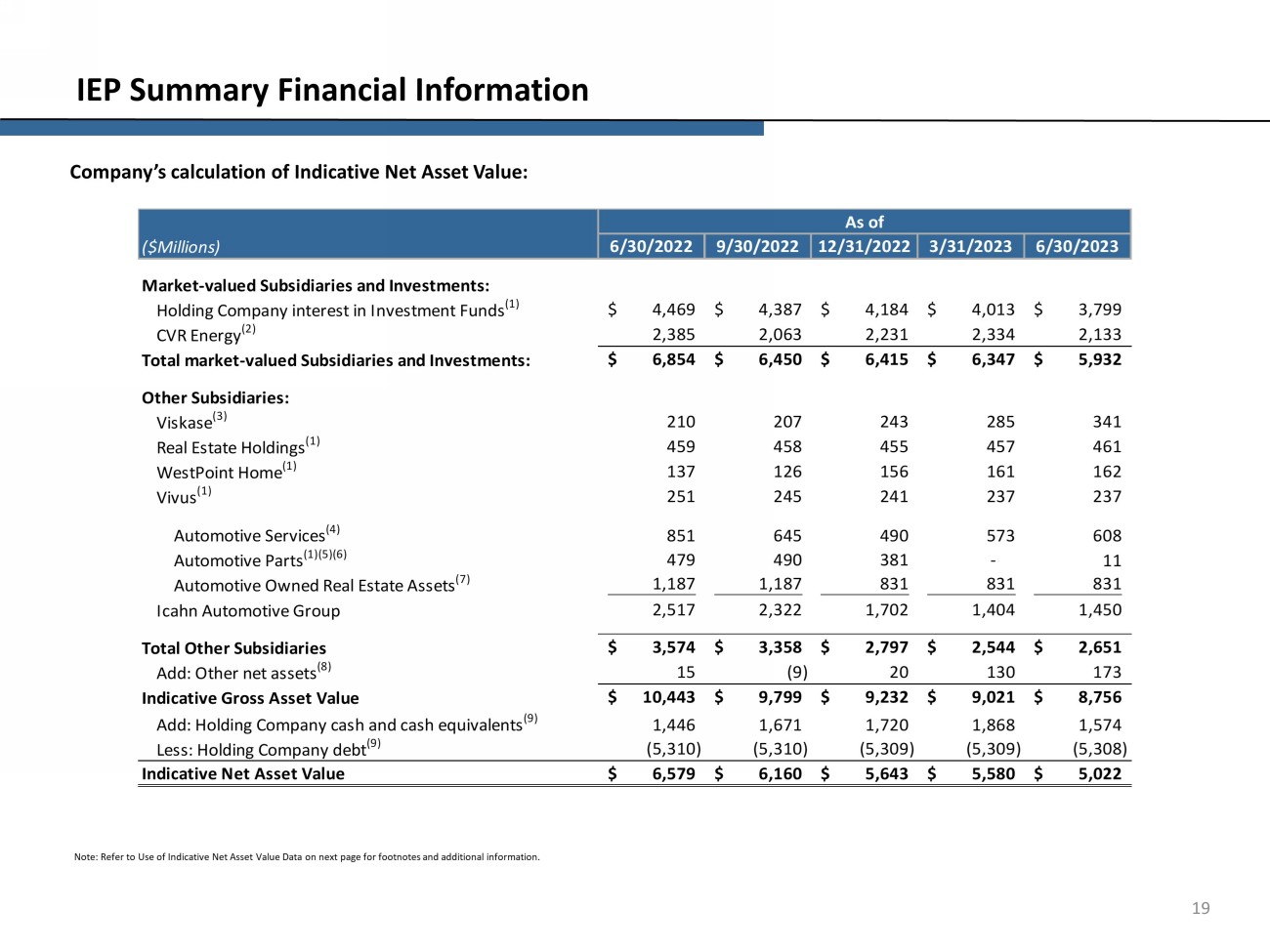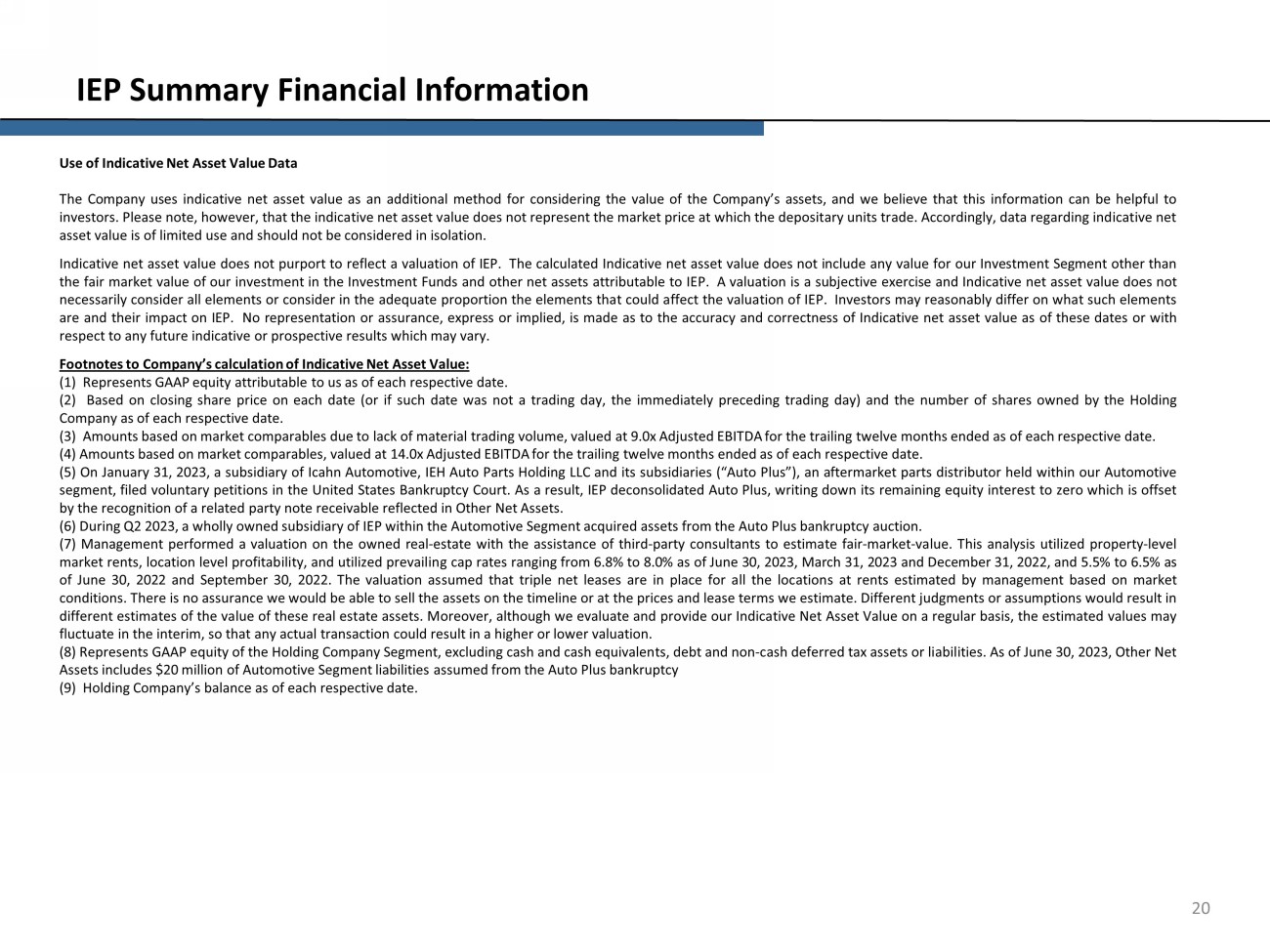 20 IEP Summary Financial Information Use of Indicative Net Asset Value Data The Company uses indicative net asset value as an additional method for considering the value of the Company’s assets, and we believe that this information can be helpful to investors . Please note, however, that the indicative net asset value does not represent the market price at which the depositary units trade . Accordingly, data regarding indicative net asset value is of limited use and should not be considered in isolation . Indicative net asset value does not purport to reflect a valuation of IEP . The calculated Indicative net asset value does not include any value for our Investment Segment other than the fair market value of our investment in the Investment Funds and other net assets attributable to IEP . A valuation is a subjective exercise and Indicative net asset value does not necessarily consider all elements or consider in the adequate proportion the elements that could affect the valuation of IEP . Investors may reasonably differ on what such elements are and their impact on IEP . No representation or assurance, express or implied, is made as to the accuracy and correctness of Indicative net asset value as of these dates or with respect to any future indicative or prospective results which may vary . Footnotes to Company’s calculation of Indicative Net Asset Value: ( 1 ) Represents GAAP equity attributable to us as of each respective date . ( 2 ) Based on closing share price on each date (or if such date was not a trading day, the immediately preceding trading day) and the number of shares owned by the Holding Company as of each respective date . ( 3 ) Amounts based on market comparables due to lack of material trading volume, valued at 9 . 0 x Adjusted EBITDA for the trailing twelve months ended as of each respective date . ( 4 ) Amounts based on market comparables , valued at 14 . 0 x Adjusted EBITDA for the trailing twelve months ended as of each respective date . ( 5 ) On January 31 , 2023 , a subsidiary of Icahn Automotive, IEH Auto Parts Holding LLC and its subsidiaries (“Auto Plus”), an aftermarket parts distributor held within our Automotive segment, filed voluntary petitions in the United States Bankruptcy Court . As a result, IEP deconsolidated Auto Plus, writing down its remaining equity interest to zero which is offset by the recognition of a related party note receivable reflected in Other Net Assets . ( 6 ) During Q 2 2023 , a wholly owned subsidiary of IEP within the Automotive Segment acquired assets from the Auto Plus bankruptcy auction . ( 7 ) Management performed a valuation on the owned real - estate with the assistance of third - party consultants to estimate fair - market - value . This analysis utilized property - level market rents, location level profitability, and utilized prevailing cap rates ranging from 6 . 8 % to 8 . 0 % as of June 30 , 2023 , March 31 , 2023 and December 31 , 2022 , and 5 . 5 % to 6 . 5 % as of June 30 , 2022 and September 30 , 2022 . The valuation assumed that triple net leases are in place for all the locations at rents estimated by management based on market conditions . There is no assurance we would be able to sell the assets on the timeline or at the prices and lease terms we estimate . Different judgments or assumptions would result in different estimates of the value of these real estate assets . Moreover, although we evaluate and provide our Indicative Net Asset Value on a regular basis, the estimated values may fluctuate in the interim, so that any actual transaction could result in a higher or lower valuation . ( 8 ) Represents GAAP equity of the Holding Company Segment, excluding cash and cash equivalents, debt and non - cash deferred tax assets or liabilities . As of June 30 , 2023 , Other Net Assets includes $ 20 million of Automotive Segment liabilities assumed from the Auto Plus bankruptcy ( 9 ) Holding Company’s balance as of each respective date .