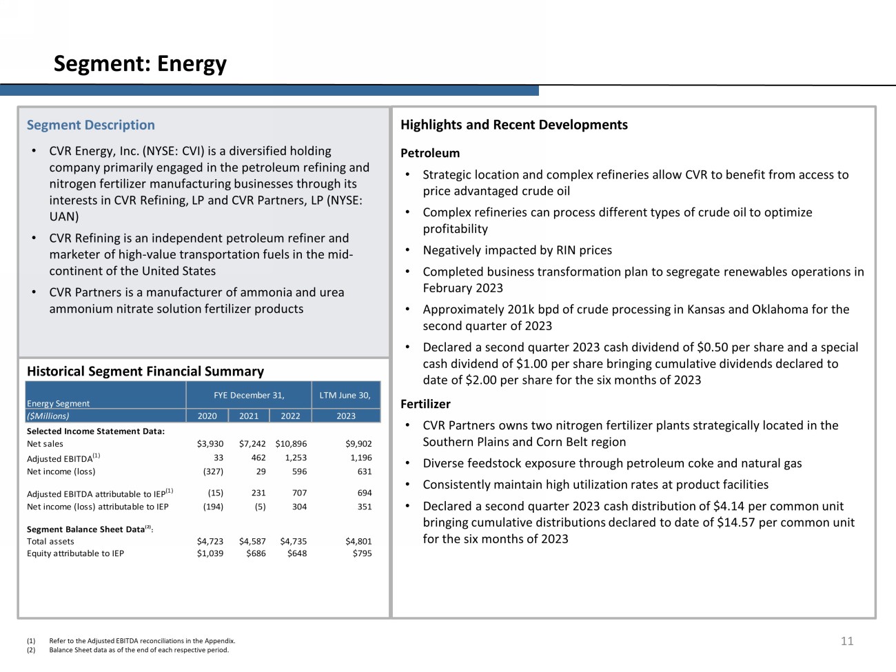 Highlights and Recent Developments • Long history of investing in public equity and debt securities and pursuing activist agenda • Employs an activist strategy that seeks to unlock hidden value through various tactics • Financial/balance sheet restructurings • Operational turnarounds • Strategic initiatives • Corporate governance changes • As of June 30, 2023, the Funds had a net short notional exposure of 18% Segment Description • IEP invests its proprietary capital through various private investment funds (the “Funds”) managed by the Investment segment • Fair value of IEP’s investment in the Funds was approximately $3.8 billion as of June 30, 2023 10 Segment: Investment Historical Segment Financial Summary (1) Based on closing share price as of specified date. (2) Total economic ownership as a percentage of common shares issued and outstanding . (3) Refer to the Adjusted EBITDA reconciliations in the Appendix . (4) Balance Sheet data as of end of each respective period. Significant Holdings As of June 30, 2023 Company Mkt. Value ($mm) (1) % Ownership ( 2 ) $835 8.01 % $ 690 15.20 % $548 2.46% $ 510 21.82 % $ 412 1.39 % ($Millions) Selected Income Statement Data: Total revenue ($1,249) $202 ($23) ($1,235) Adjusted EBITDA (3) (1,251) 186 (50) (1,264) Net income (loss) (1,447) (32) (223) (1,435) Adjusted EBITDA attributable to IEP (3) (673) 83 (10) (590) Net income (loss) attributable to IEP (765) (16) (89) (671) Returns -14.3% -0.3% -2.4% -15.0% Segment Balance Sheet Data (4) : Equity attributable to IEP $4,283 $4,271 $4,184 $3,799 Total Equity $9,342 $9,390 $9,150 $6,881 Investment Segment FYE December 31, LTM June 30,  20232020 2021 2022