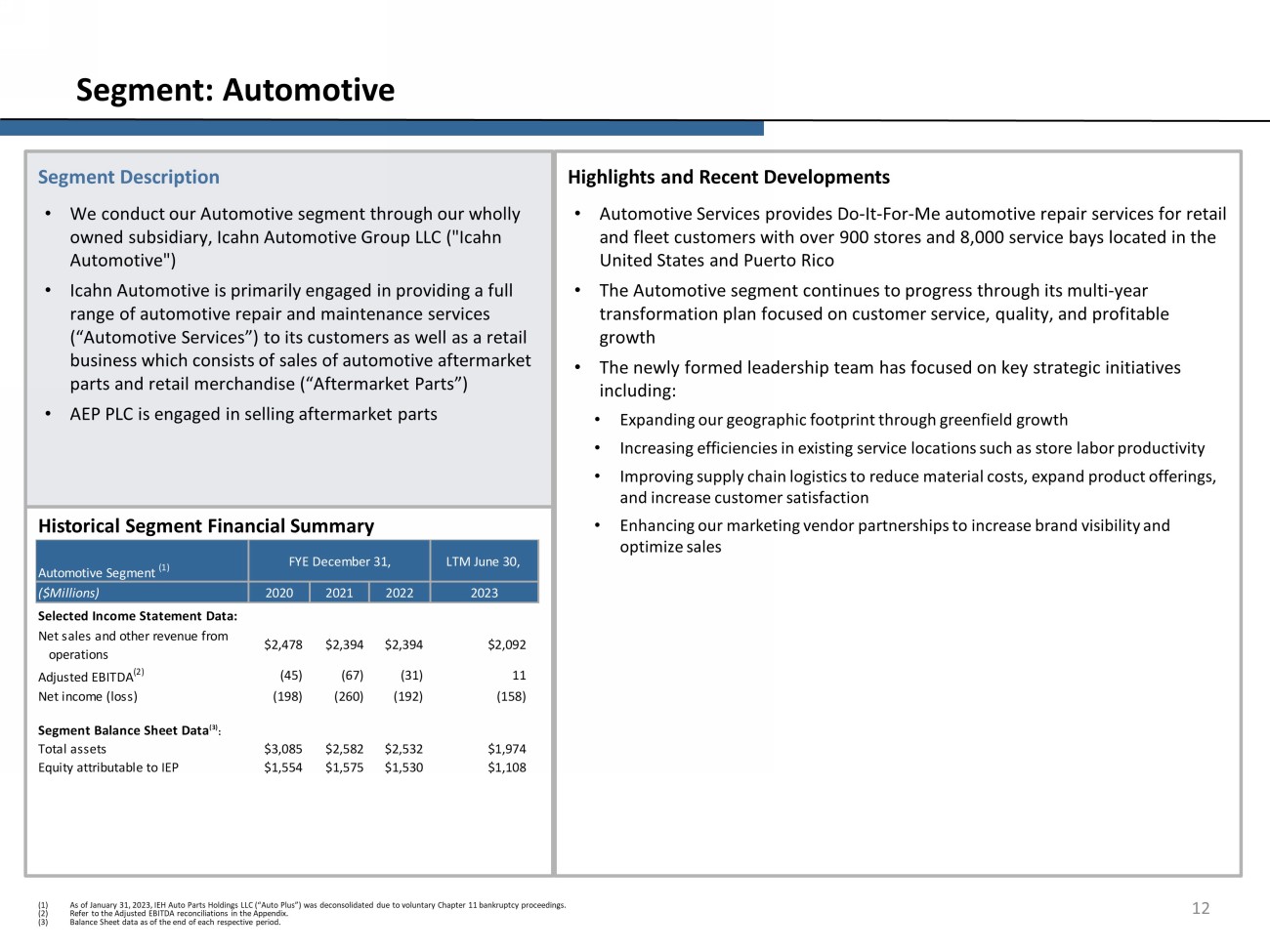 Highlights and Recent Developments • Automotive Services provides Do - It - For - Me automotive repair services for retail and fleet customers with over 900 stores and 8,000 service bays located in the United States and Puerto Rico • The Automotive segment continues to progress through its multi - year transformation plan focused on customer service, quality, and profitable growth • The newly formed leadership team has focused on key strategic initiatives including: • Expanding our geographic footprint through greenfield growth • Increasing efficiencies in existing service locations such as store labor productivity • Improving supply chain logistics to reduce material costs, expand product offerings, and increase customer satisfaction • Enhancing our marketing vendor partnerships to increase brand visibility and optimize sales Segment Description • We conduct our Automotive segment through our wholly owned subsidiary, Icahn Automotive Group LLC ("Icahn Automotive") • Icahn Automotive is primarily engaged in providing a full range of automotive repair and maintenance services (“Automotive Services”) to its customers as well as a retail business which consists of sales of automotive aftermarket parts and retail merchandise (“Aftermarket Parts”) • AEP PLC is engaged in selling aftermarket parts 12 Segment: Automotive Historical Segment Financial Summary (1) As of January 31, 2023, IEH Auto Parts Holdings LLC (“Auto Plus”) was deconsolidated due to voluntary Chapter 11 bankruptcy p roc eedings. (2) Refer to the Adjusted EBITDA reconciliations in the Appendix . (3) Balance Sheet data as of the end of each respective period . ($Millions) Selected Income Statement Data: Net sales and other revenue from operations $2,478 $2,394 $2,394 $2,092 Adjusted EBITDA (2) (45) (67) (31) 11 Net income (loss) (198) (260) (192) (158) Segment Balance Sheet Data (3) : Total assets $3,085 $2,582 $2,532 $1,974 Equity attributable to IEP $1,554 $1,575 $1,530 $1,108 Automotive Segment (1) FYE December 31, LTM June 30,  20232020 2021 2022