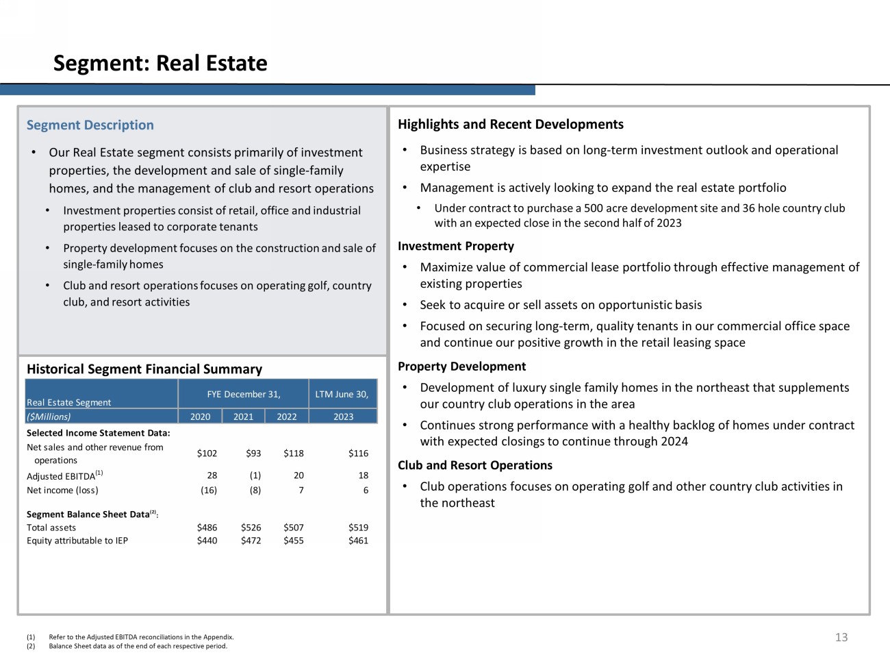 Highlights and Recent Developments • Business strategy is based on long - term investment outlook and operational expertise • Management is actively looking to expand the real estate portfolio • Under contract to purchase a 500 acre development site and 36 hole country club with an expected close in the second half of 2023 Investment Property • Maximize value of commercial lease portfolio through effective management of existing properties • Seek to acquire or sell assets on opportunistic basis • Focused on securing long - term, quality tenants in our commercial office space and continue our positive growth in the retail leasing space Property Development • Development of luxury single family homes in the northeast that supplements our country club operations in the area • Continues strong performance with a healthy backlog of homes under contract with expected closings to continue through 2024 Club and Resort Operations • Club operations focuses on operating golf and other country club activities in the northeast Segment Description • Our Real Estate segment consists primarily of investment properties, the development and sale of single - family homes, and the management of club and resort operations • Investment properties consist of retail, office and industrial properties leased to corporate tenants • Property development focuses on the construction and sale of single - family homes • Club and resort operations focuses on operating golf, country club, and resort activities 13 Segment: Real Estate Historical Segment Financial Summary (1) Refer to the Adjusted EBITDA reconciliations in the Appendix. (2) Balance Sheet data as of the end of each respective period. ($Millions) Selected Income Statement Data: Net sales and other revenue from operations $102 $93 $118 $116 Adjusted EBITDA (1) 28 (1) 20 18 Net income (loss) (16) (8) 7 6 Segment Balance Sheet Data (2) : Total assets $486 $526 $507 $519 Equity attributable to IEP $440 $472 $455 $461 Real Estate Segment FYE December 31, LTM June 30,  20232020 2021 2022