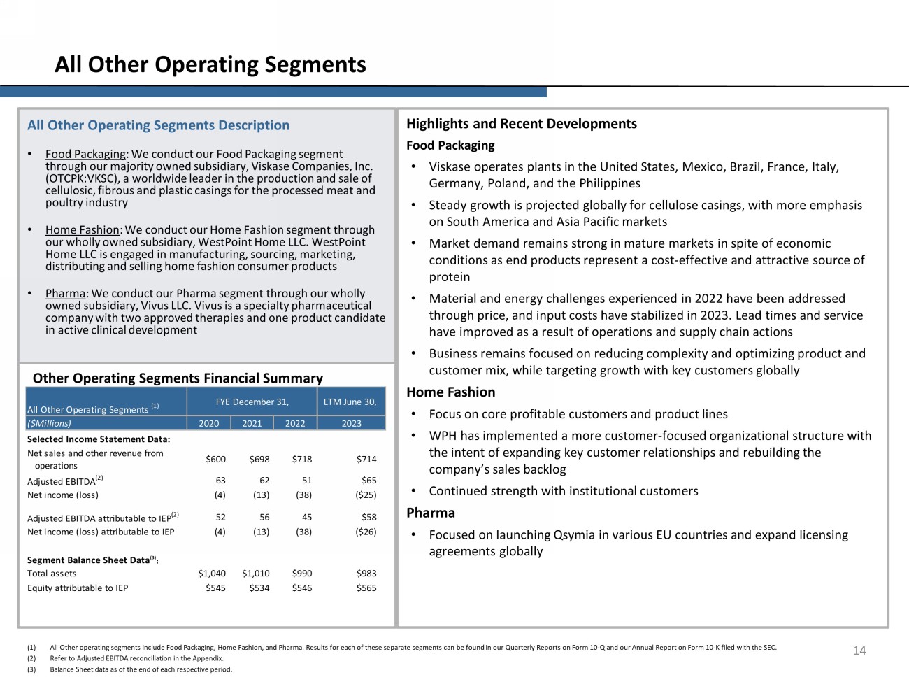 Highlights and Recent Developments Food Packaging • Viskase operates plants in the United States, Mexico, Brazil, France, Italy, Germany, Poland, and the Philippines • Steady growth is projected globally for cellulose casings, with more emphasis on South America and Asia Pacific markets • Market demand remains strong in mature markets in spite of economic conditions as end products represent a cost - effective and attractive source of protein • Material and energy challenges experienced in 2022 have been addressed through price, and input costs have stabilized in 2023. Lead times and service have improved as a result of operations and supply chain actions • Business remains focused on reducing complexity and optimizing product and customer mix, while targeting growth with key customers globally Home Fashion • Focus on core profitable customers and product lines • WPH has implemented a more customer - focused organizational structure with the intent of expanding key customer relationships and rebuilding the company’s sales backlog • Continued strength with institutional customers Pharma • Focused on launching Qsymia in various EU countries and expand licensing agreements globally All Other Operating Segments Description • Food Packaging : We conduct our Food Packaging segment through our majority owned subsidiary, Viskase Companies, Inc. (OTCPK:VKSC), a worldwide leader in the production and sale of cellulosic, fibrous and plastic casings for the processed meat and poultry industry • Home Fashion : We conduct our Home Fashion segment through our wholly owned subsidiary, WestPoint Home LLC. WestPoint Home LLC is engaged in manufacturing, sourcing, marketing, distributing and selling home fashion consumer products • Pharma : We conduct our Pharma segment through our wholly owned subsidiary, Vivus LLC. Vivus is a specialty pharmaceutical company with two approved therapies and one product candidate in active clinical development 14 All Other Operating Segments Other Operating Segments Financial Summary (1) All Other operating segments include Food Packaging, Home Fashion, and Pharma. Results for each of these separate segments ca n b e found in our Quarterly Reports on Form 10 - Q and our Annual Report on Form 10 - K filed with the SEC. (2) Refer to Adjusted EBITDA reconciliation in the Appendix. (3) Balance Sheet data as of the end of each respective period. ($Millions) Selected Income Statement Data: Net sales and other revenue from operations $600 $698 $718 $714 Adjusted EBITDA (2) 63 62 51 $65 Net income (loss) (4) (13) (38) ($25) Adjusted EBITDA attributable to IEP (2) 52 56 45 $58 Net income (loss) attributable to IEP (4) (13) (38) ($26) Segment Balance Sheet Data (3) : Total assets $1,040 $1,010 $990 $983 Equity attributable to IEP $545 $534 $546 $565 All Other Operating Segments (1) FYE December 31, LTM June 30,  2021 2022 20232020
