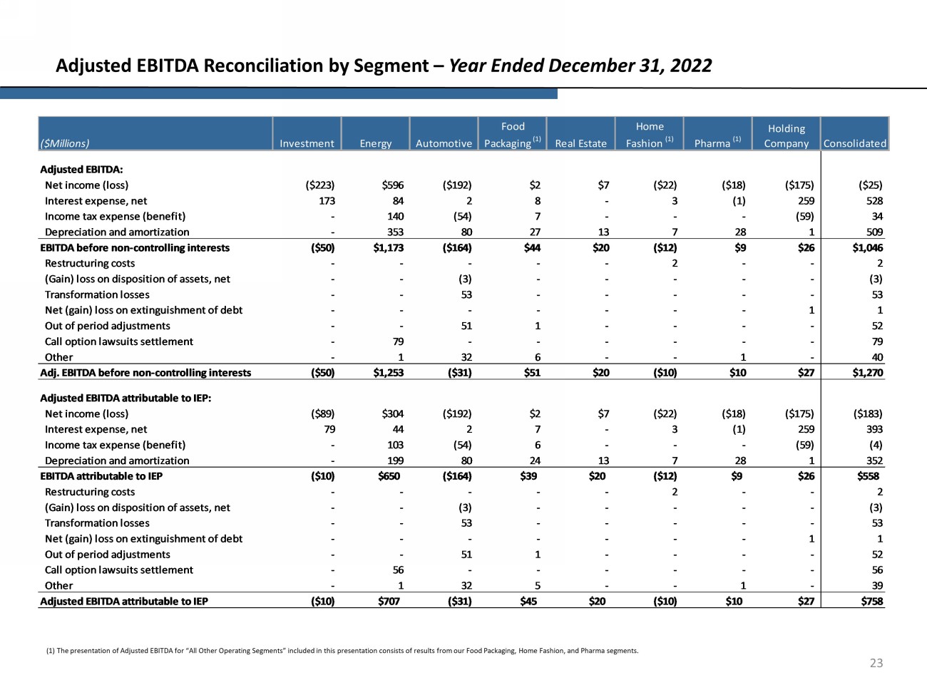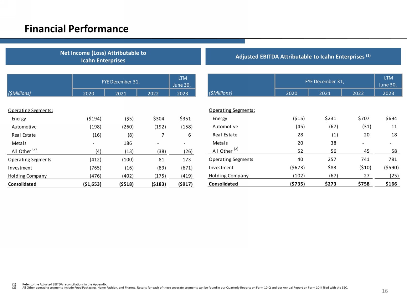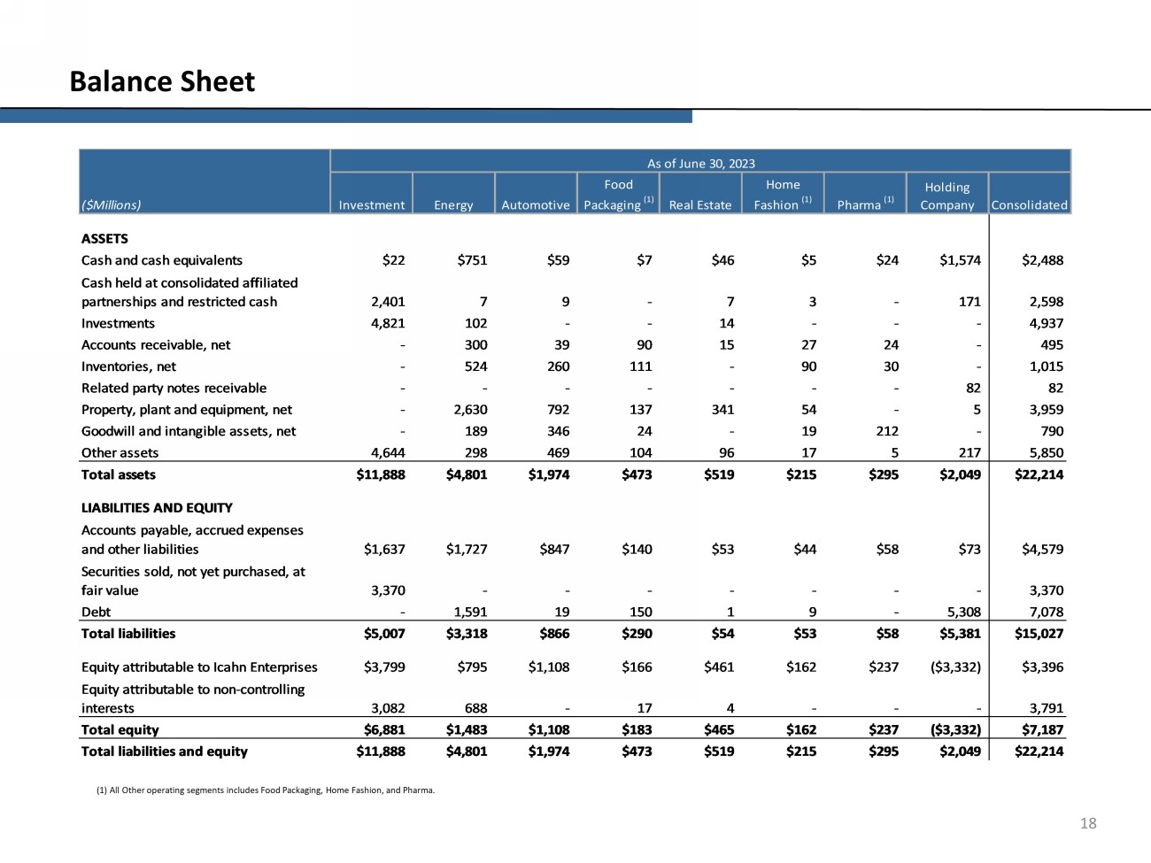 17 Consolidated Financial Snapshot Net Income (Loss): Investment ($1,447) ($32) ($223) $402 ($810) ($1,435) Energy (327) 29 596 368 403 631 Automotive (198) (260) (192) (43) (9) (158) Real Estate (16) (8) 7 4 3 6 Metals - 186 - - - - All Other (1) (4) (13) (38) (6) 7 (25) Holding Company (476) (402) (175) (127) (371) (419) Net income (loss) ($2,468) ($500) ($25) $598 ($777) ($1,400) Less: net income (loss) attributable to non-controlling interests (815) 18 158 403 (238) (483) Net income (loss) attributable to Icahn Enterprises ($1,653) ($518) ($183) $195 ($539) ($917) Adjusted EBITDA (2) : Investment ($1,251) $186 ($50) $487 ($727) ($1,264) Energy 33 462 1,253 758 701 1,196 Automotive (45) (67) (31) 11 53 11 Real Estate 28 (1) 20 10 8 18 Metals 20 38 - - - - All Other (1) 63 62 51 37 51 65 Holding Company (102) (67) 27 37 (15) (25) Consolidated Adjusted EBITDA ($1,254) $613 $1,270 $1,340 $71 $1 Less: Adjusted EBITDA attributable to non-controlling interests (519) 340 512 598 (79) (165) Adjusted EBITDA attributable to Icahn Enterprises ($735) $273 $758 $742 $150 $166 Capital Expenditures $199 $305 $338 $154 $131 $315 ($Millions) FYE December 31, Six months ended June 30,  LTM June 30,  2020 2021 2022 2022 2023 2023 (1) All Other operating segments include Food Packaging, Home Fashion, and Pharma. Results for each of these separate segments ca n b e found in our Quarterly Reports on Form 10 - Q and our Annual Report on Form 10 - K filed with the SEC. (2) Refer to the Adjusted EBITDA reconciliations in the Appendix.