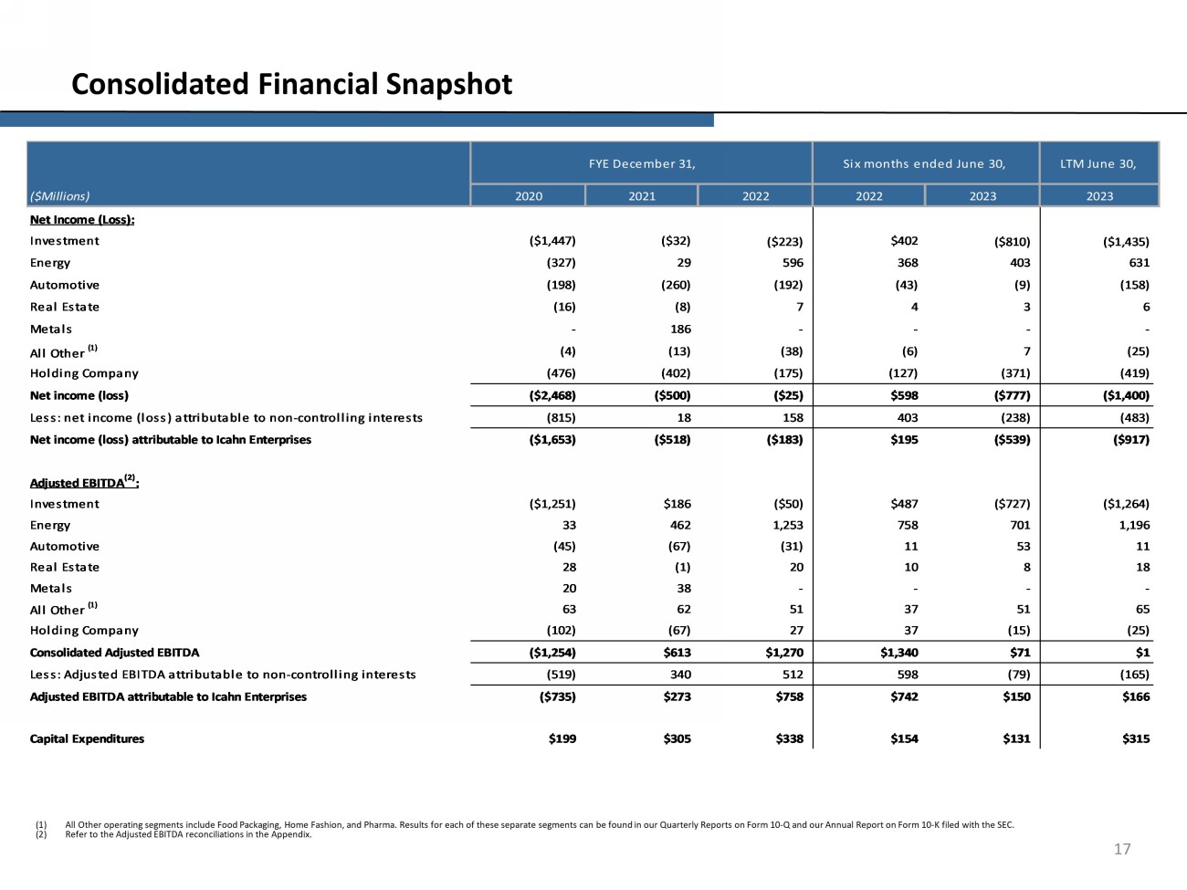 16 Financial Performance Net Income (Loss) Attributable to Icahn Enterprises Adjusted EBITDA Attributable to Icahn Enterprises (1) (1) Refer to the Adjusted EBITDA reconciliations in the Appendix. (2) All Other operating segments include Food Packaging, Home Fashion, and Pharma. Results for each of these separate segments ca n b e found in our Quarterly Reports on Form 10 - Q and our Annual Report on Form 10 - K filed with the SEC. ($Millions) Operating Segments: Energy ($194) ($5) $304 $351 Automotive (198) (260) (192) (158) Real Estate (16) (8) 7 6 Metals - 186 - - All Other (2) (4) (13) (38) (26) Operating Segments (412) (100) 81 173 Investment (765) (16) (89) (671) Holding Company (476) (402) (175) (419) Consolidated ($1,653) ($518) ($183) ($917) FYE December 31, LTM June 30,  2020 2021 2022 2023 ($Millions) Operating Segments: Energy ($15) $231 $707 $694 Automotive (45) (67) (31) 11 Real Estate 28 (1) 20 18 Metals 20 38 - - All Other (2) 52 56 45 58 Operating Segments 40 257 741 781 Investment ($673) $83 ($10) ($590) Holding Company (102) (67) 27 (25) Consolidated ($735) $273 $758 $166 2023 LTM June 30,  FYE December 31, 2020 2021 2022